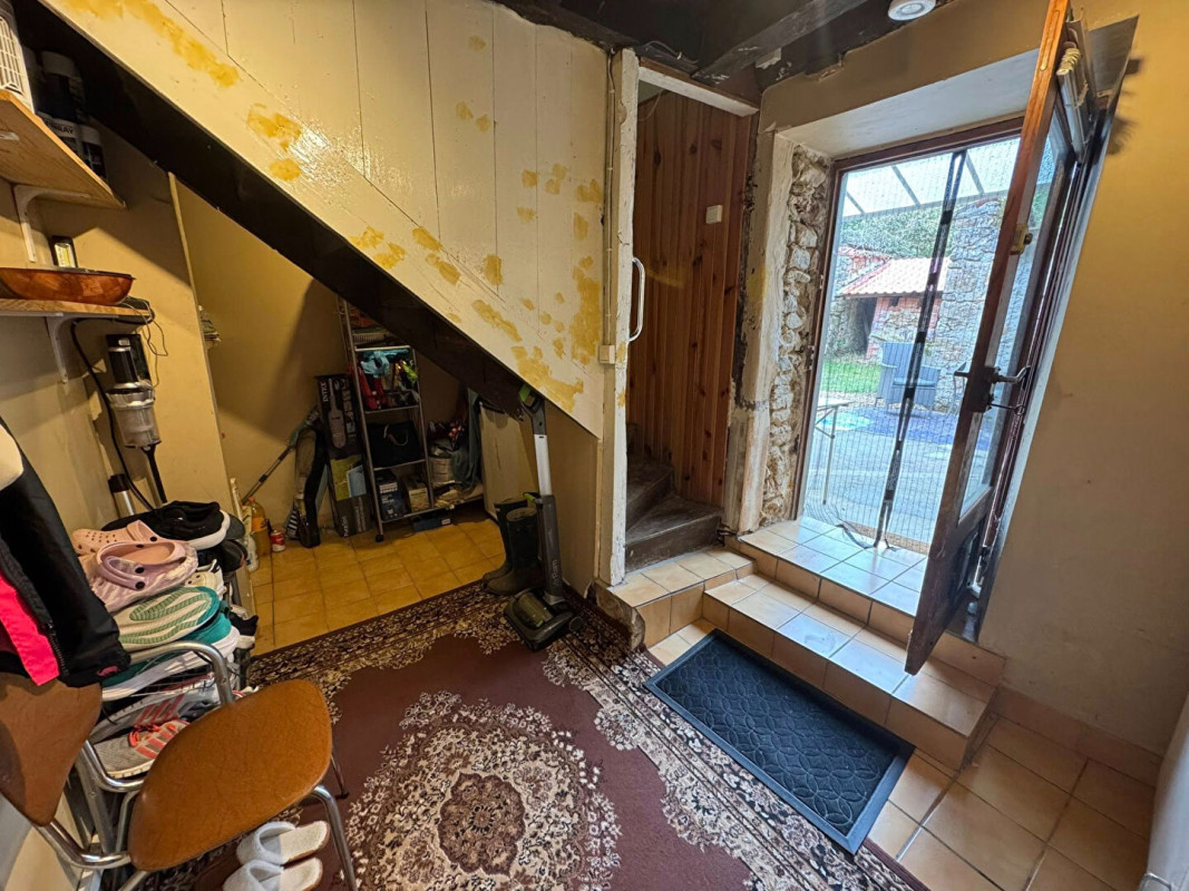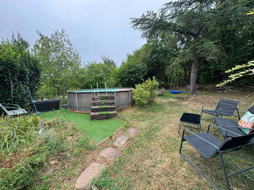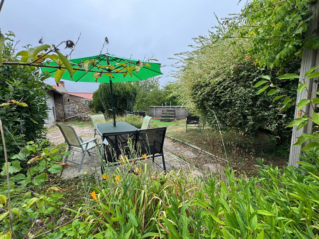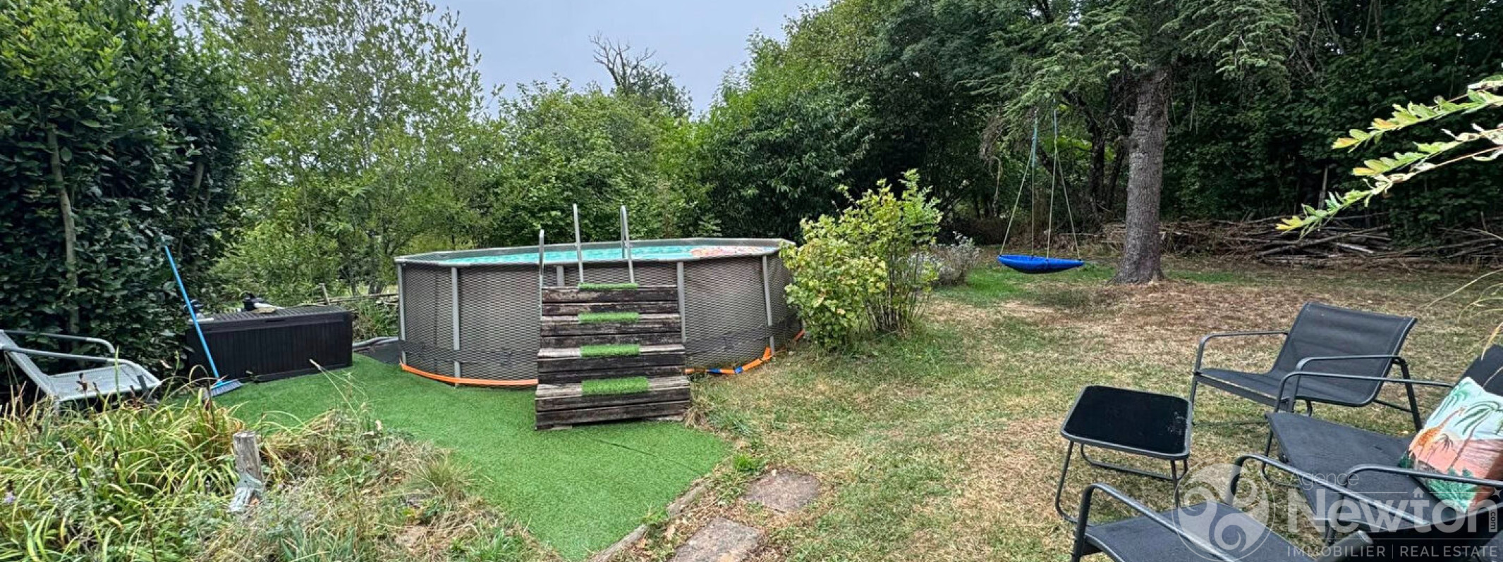 Outside, the 1,300 m² garden offers a grassy lawn, an above-ground swimming pool, fruit trees, and a private terrace perfect for relaxing or entertaining. The property also boasts an impressive collection of outbuildings, including a large barn, wood hanger, and an old piggery.