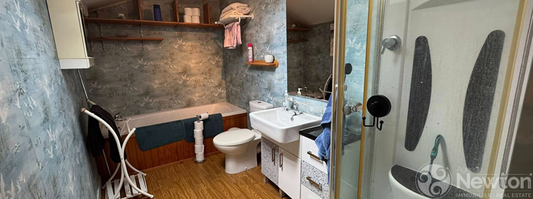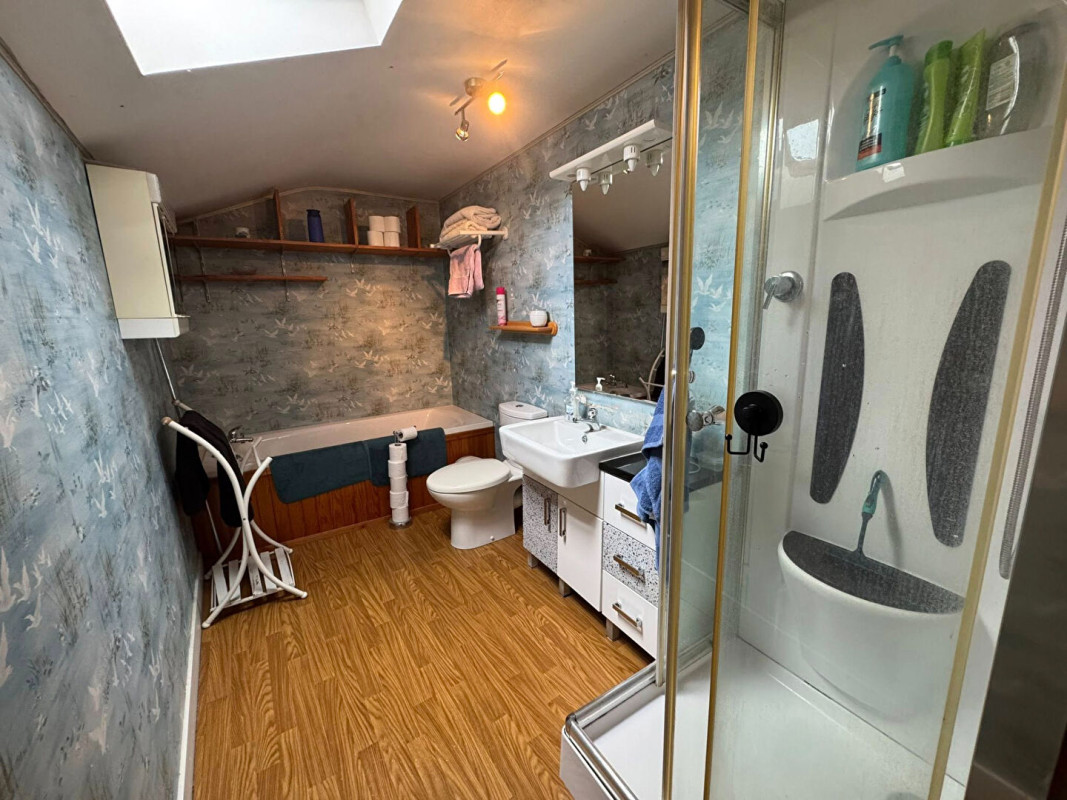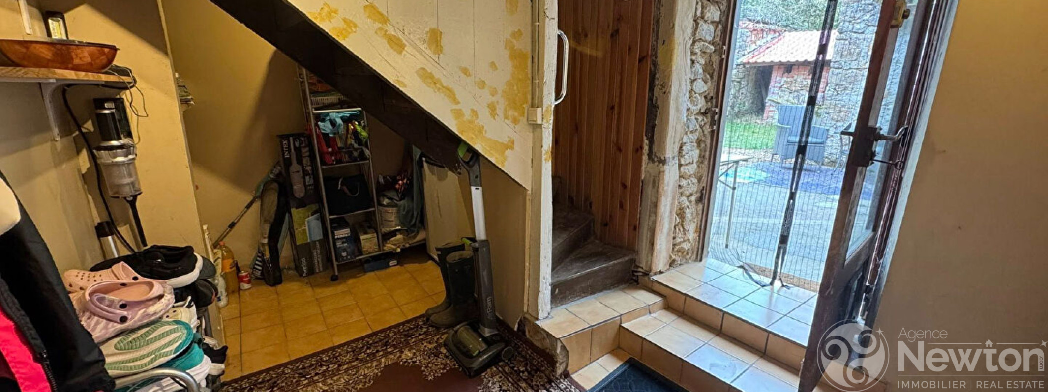 Outside, the 1,300 m² garden offers a grassy lawn, an above-ground swimming pool, fruit trees, and a private terrace perfect for relaxing or entertaining. The property also boasts an impressive collection of outbuildings, including a large barn, wood hanger, and an old piggery.