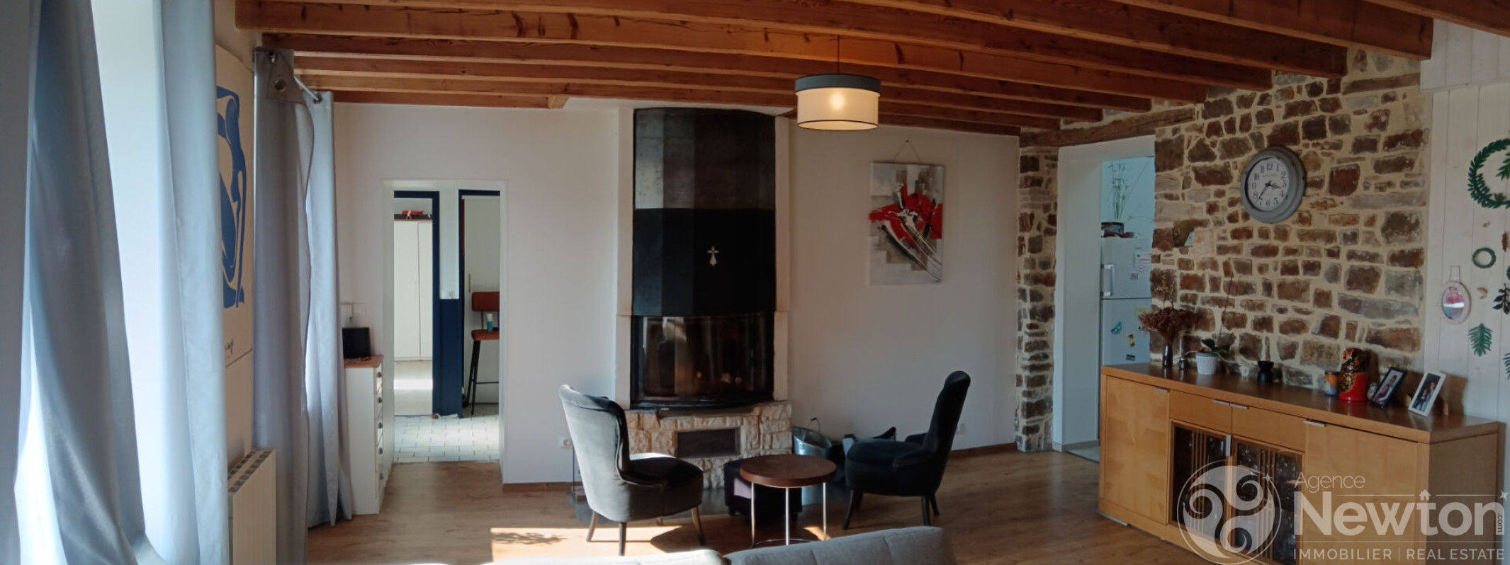 Un espace de vie spacieux : le coeur de la maison est un grand salon confortable, articulé autour d'un magnifique poêle à bois, parfait pour passer des soirées chaleureuses.