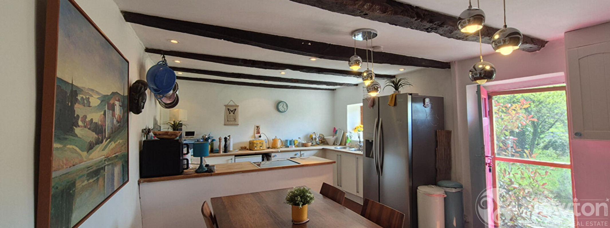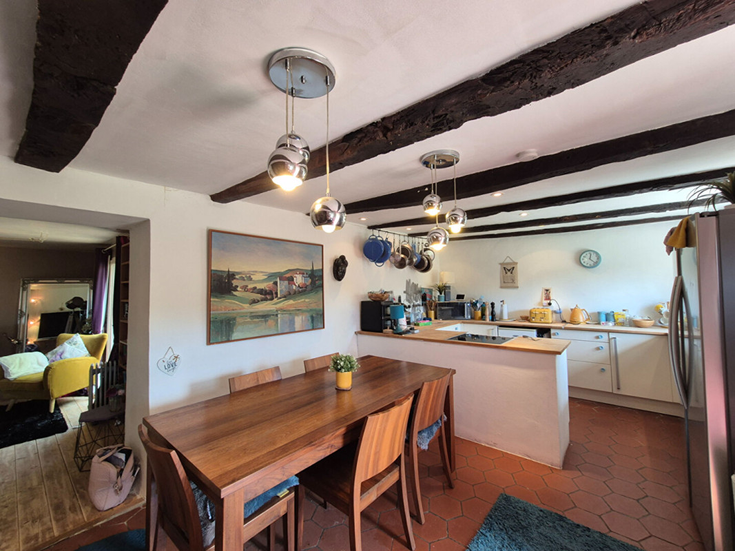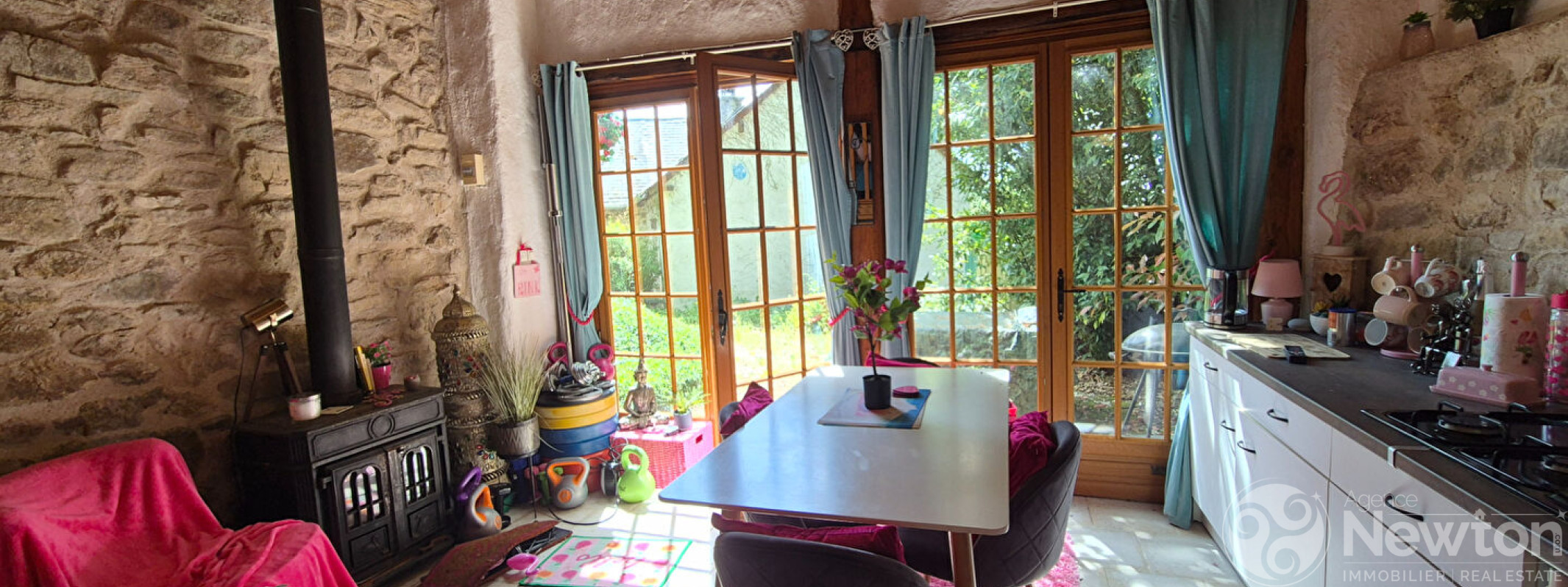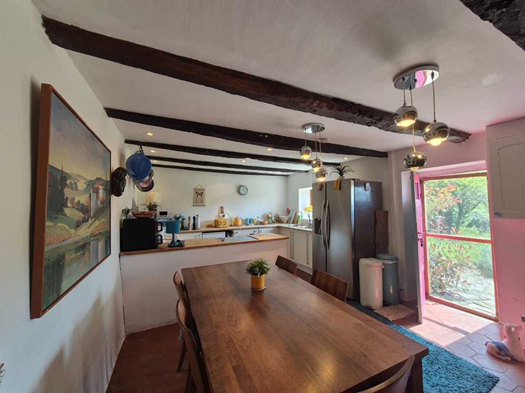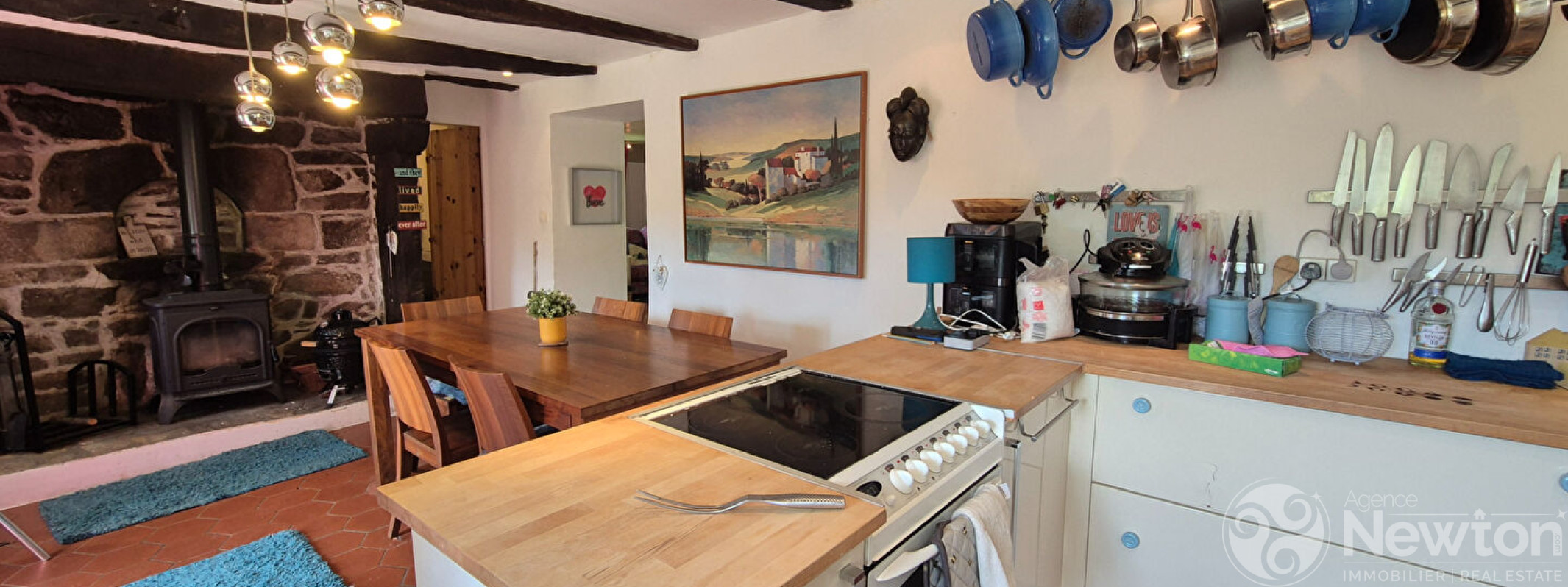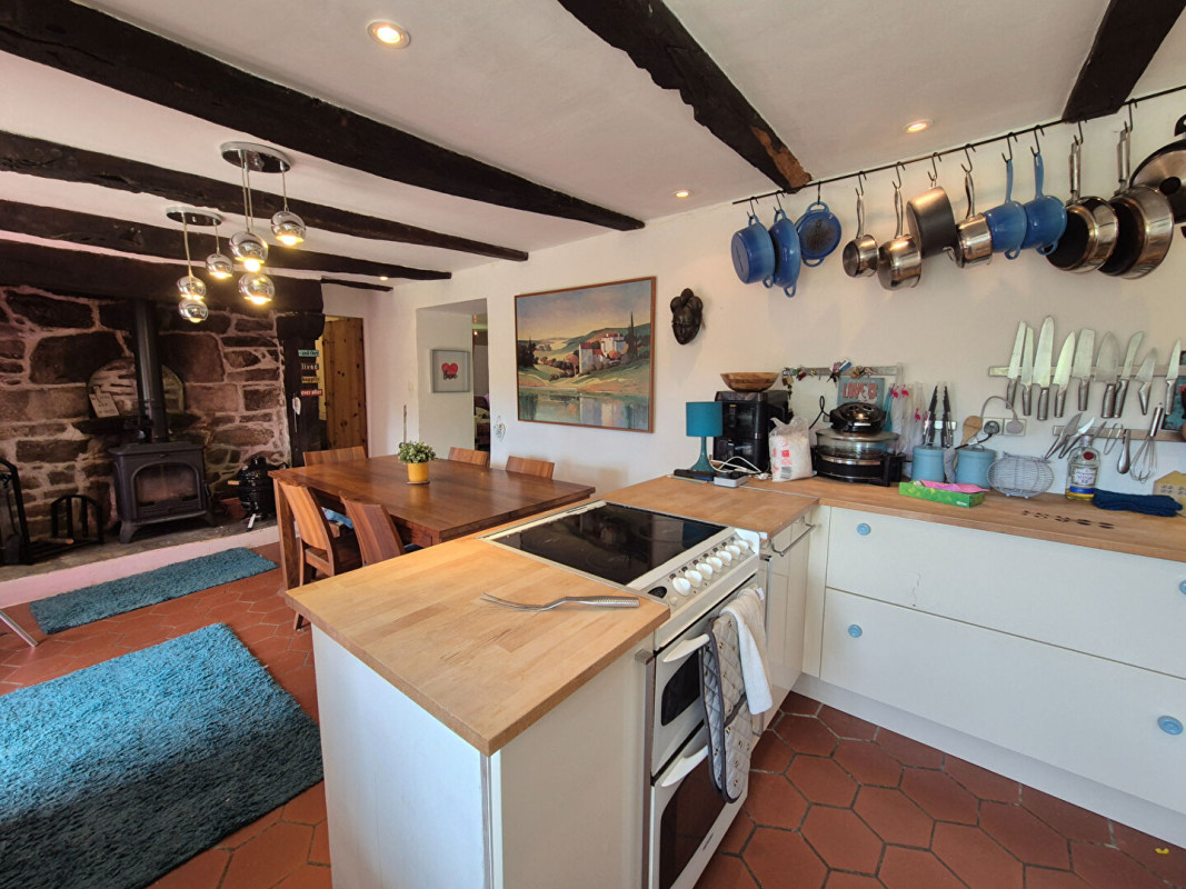 En entrant dans la maison, vous arrivez dans une cuisine spacieuse et accueillante avec coin repas de 23,6 m², où une belle cheminée abritant un poêle à bois chaleureux occupe le centre de la pièce.