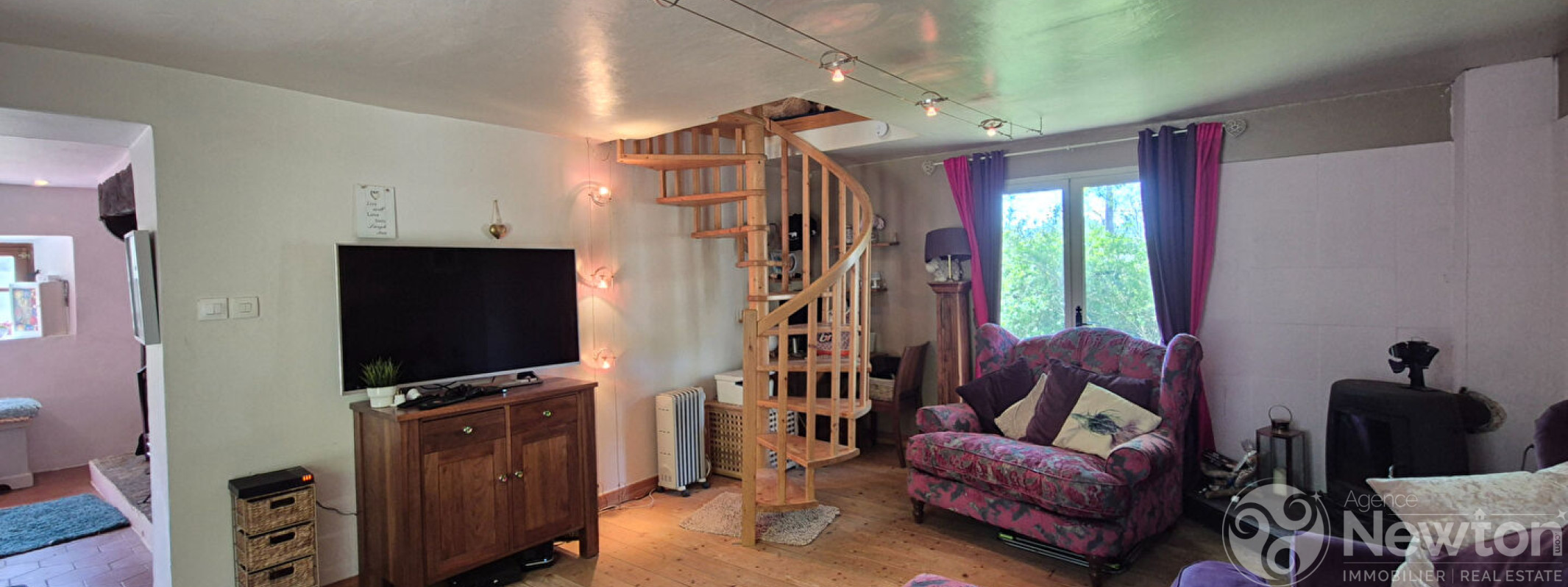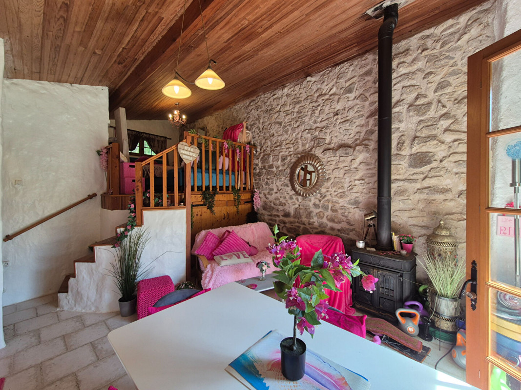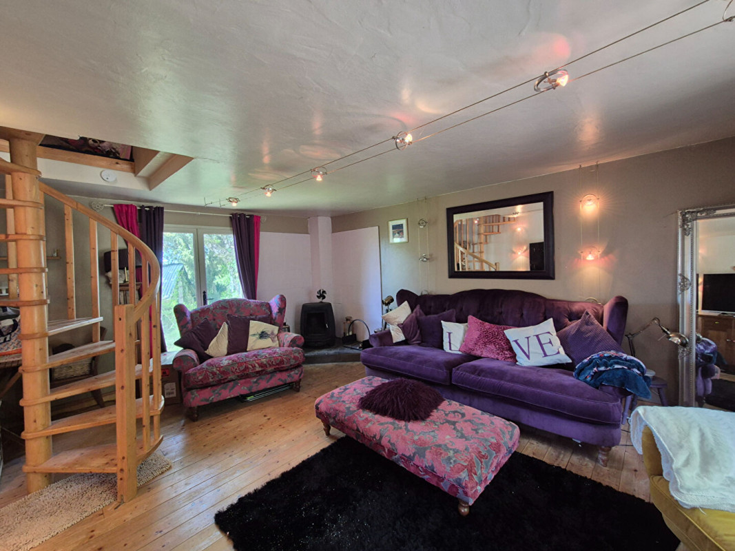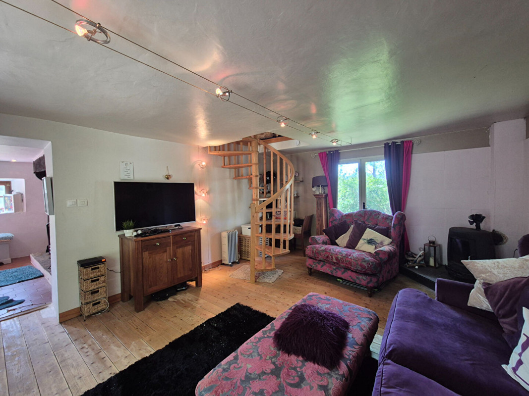 Depuis la cuisine, on accède à un salon de 22,6 m² avec un poêle à bois d'angle et un escalier en colimaçon dans le coin opposé qui mène au premier étage.