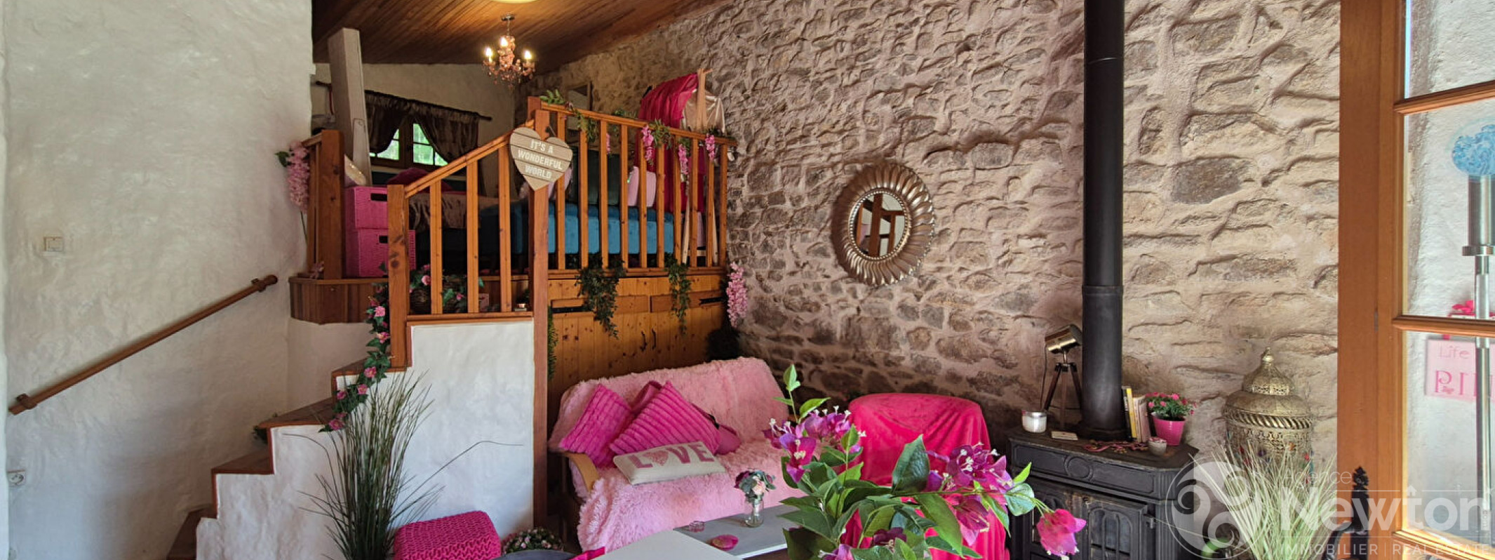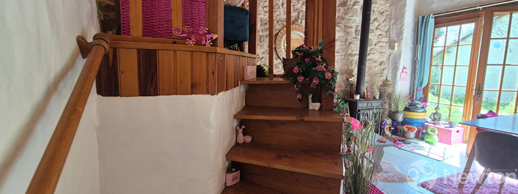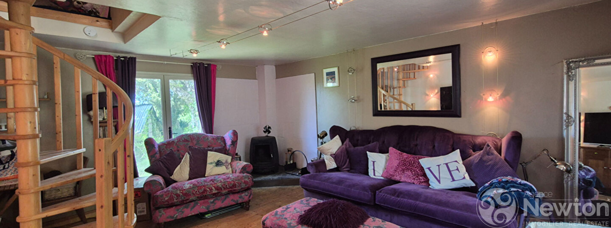 Depuis la cuisine, on accède à un salon de 22,6 m² avec un poêle à bois d'angle et un escalier en colimaçon dans le coin opposé qui mène au premier étage.