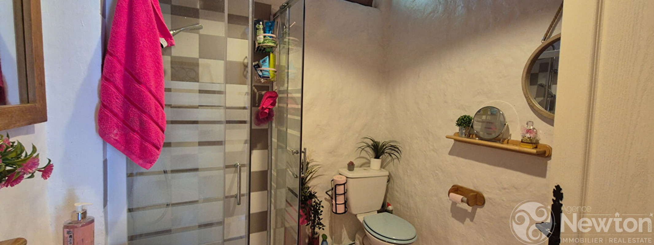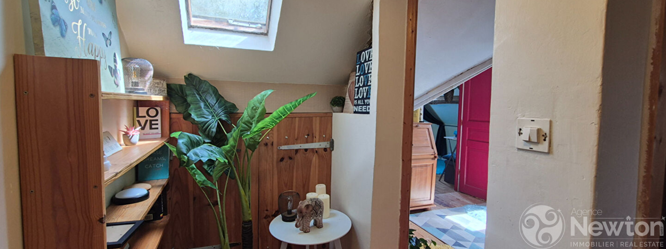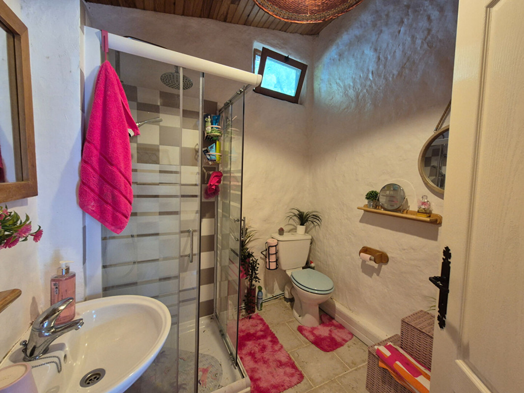 A gauche de la cheminée, une porte s'ouvre sur une buanderie spacieuse de 5,6 m² et, de l'autre côté de la cheminée, se trouve un WC avec lavabo.