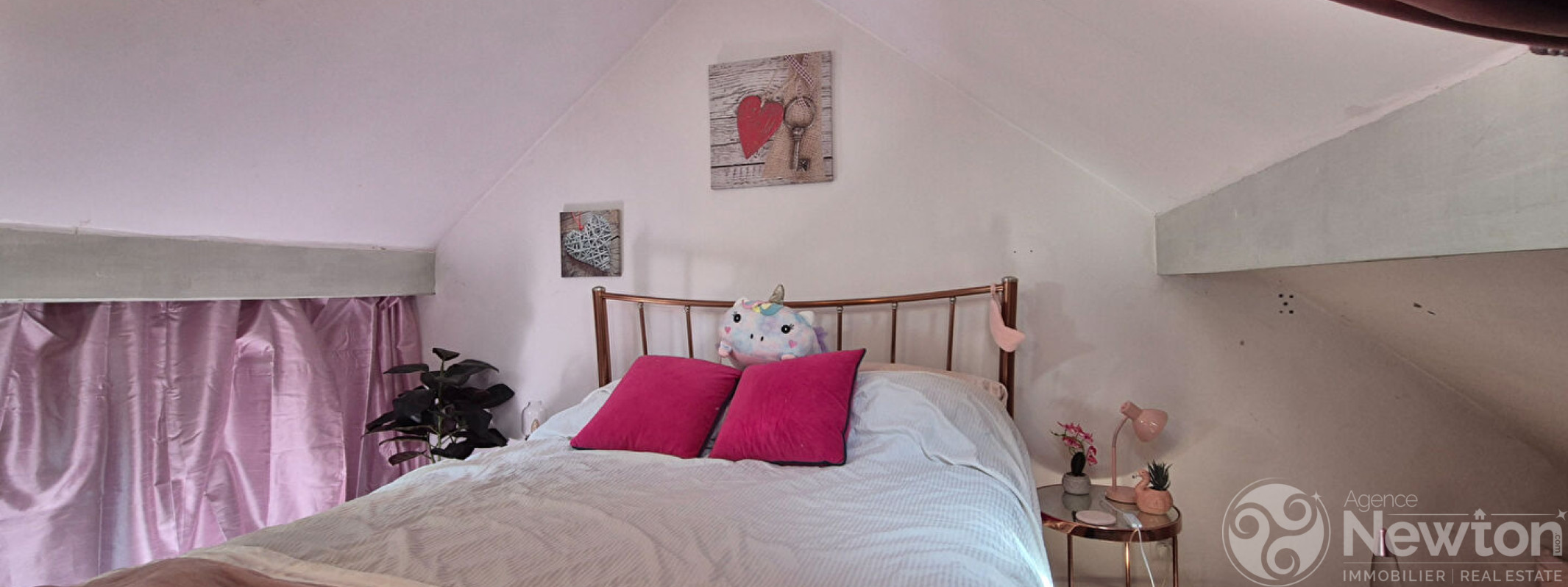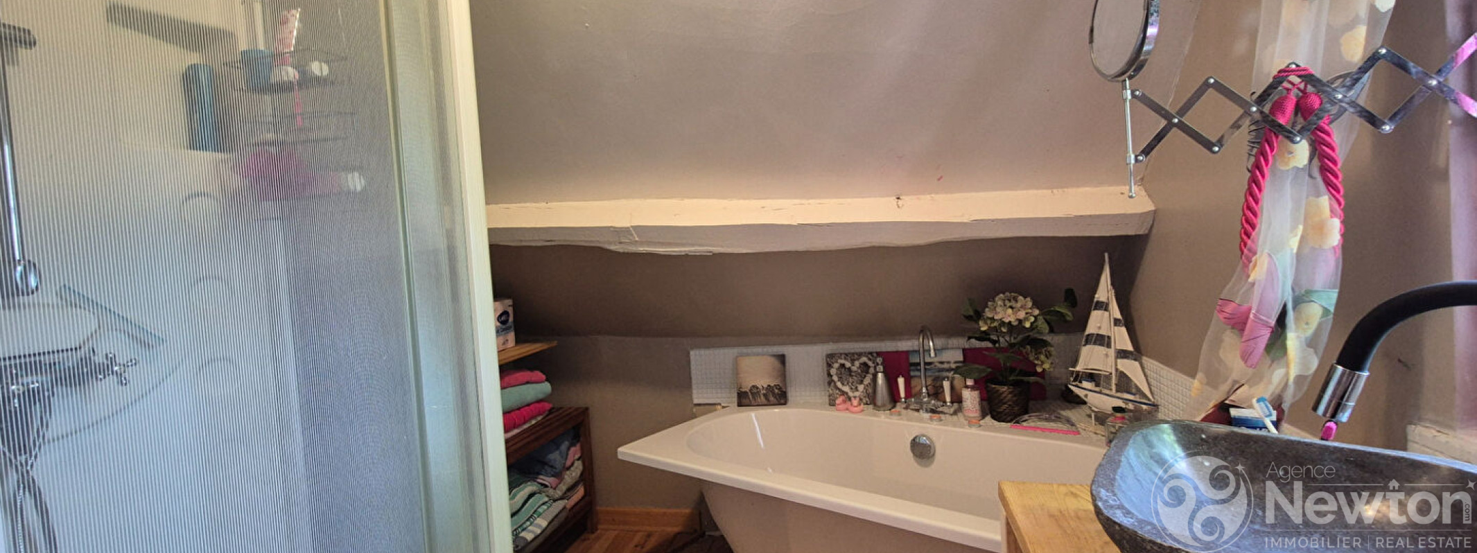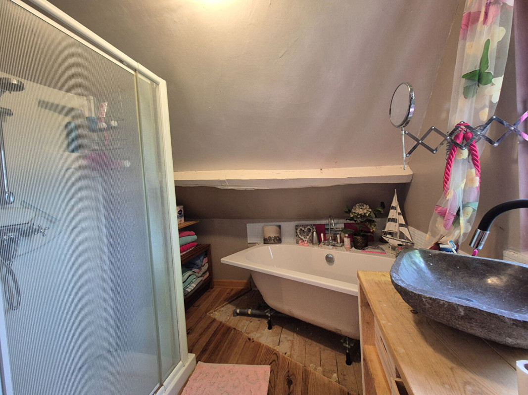 Au premier étage, un petit couloir mène à deux chambres (8 m² et 9 m²), une salle de bains avec baignoire et une grande douche, ainsi qu'un espace où un lit d'appoint pourrait être installé pour accueillir un invité supplémentaire.