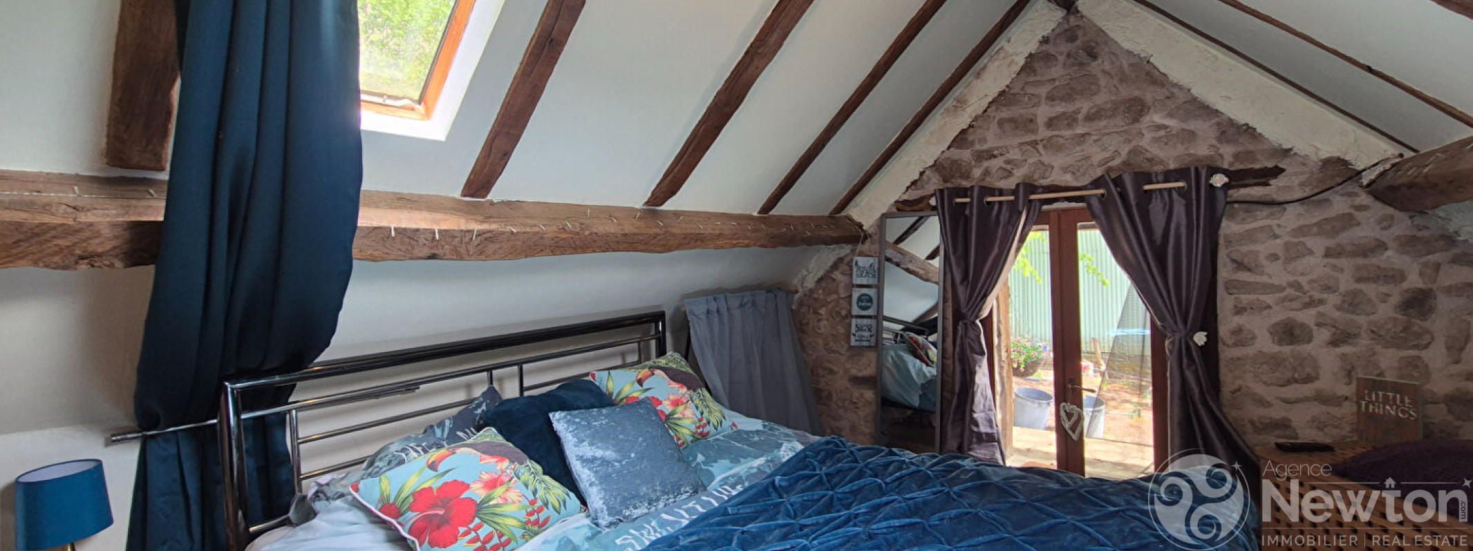La chambre principale dispose de portes donnant sur un escalier extérieur menant au jardin, une touche très originale !