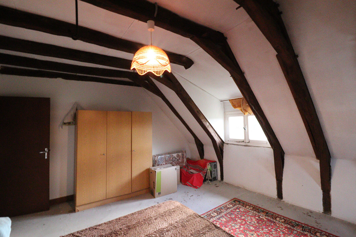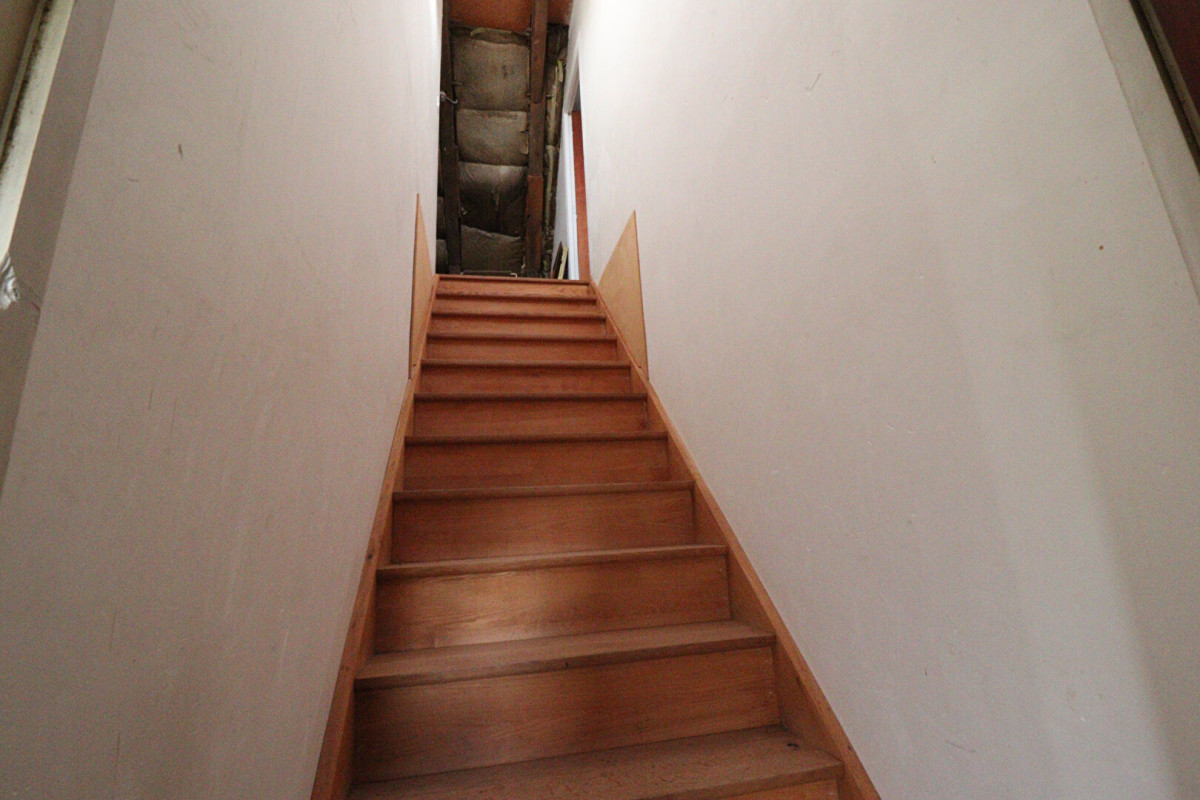 En face de la porte d'entrée, une autre porte s'ouvre sur un large escalier en bois qui mène au premier étage. Cet étage offre 2 chambres (25,3m2 et 21,1m2), chacune avec des poutres de toit et des poutres apparentes, ainsi qu'un espace qui se prêterait à un petit dressing (7,4m2).