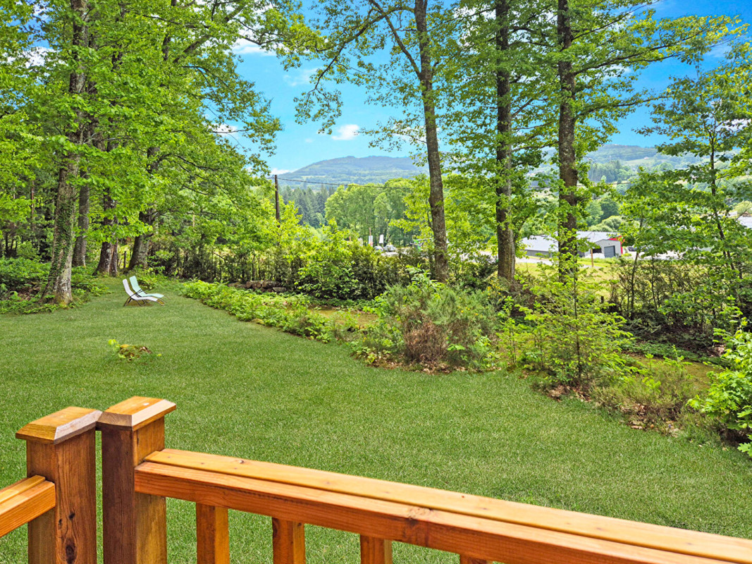 Le jardin bordé d'arbres est magnifique et offre une vue sur les collines des Monédieres au loin.