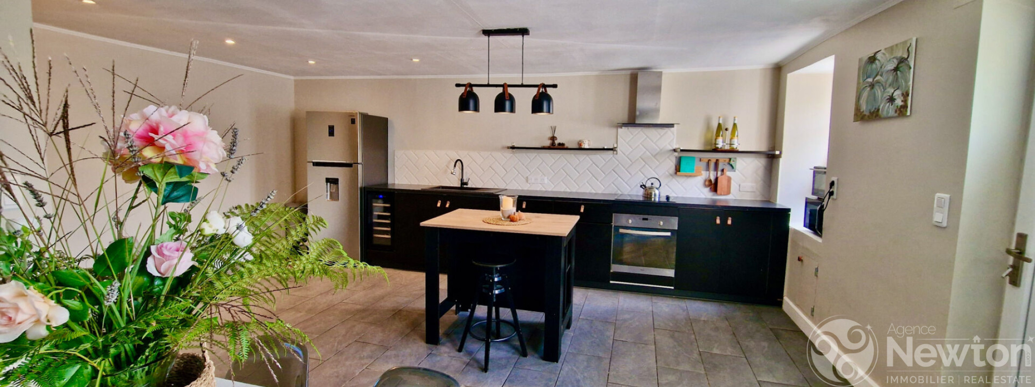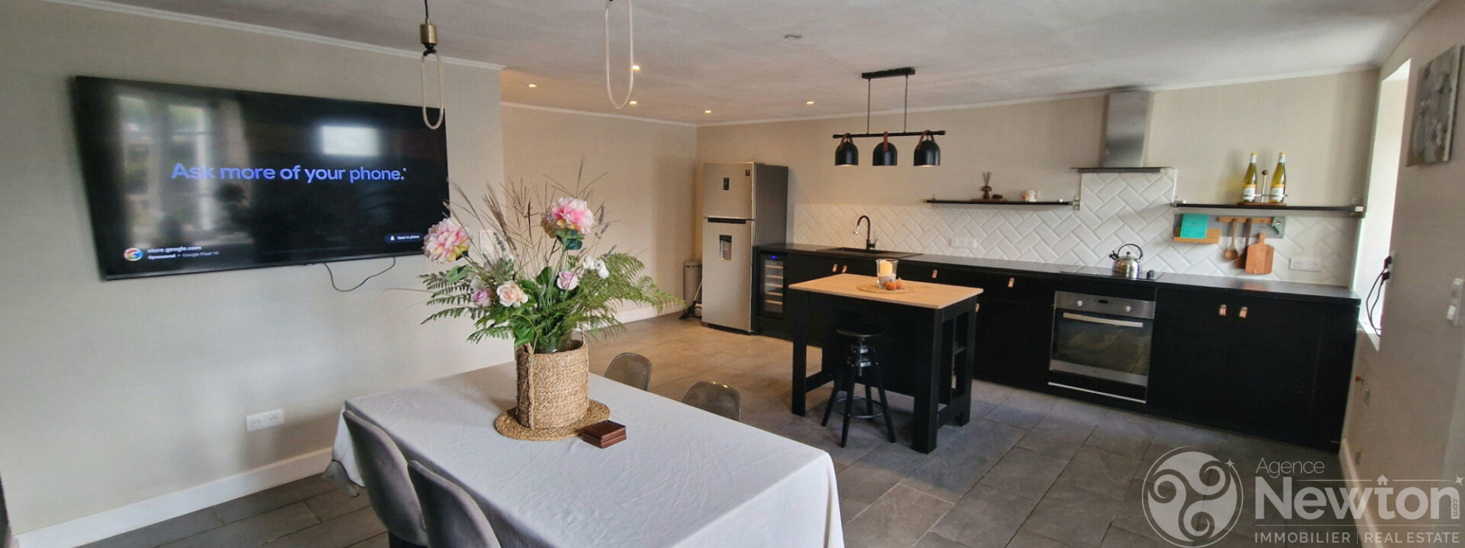 Au rez-de-chaussée, une grande cuisine-salle à manger moderne, une buanderie, une salle de bains et un salon avec cheminée électrique. (Un poêle à bois peut facilement être installé pour les 'cosy' soirées d'hiver.)