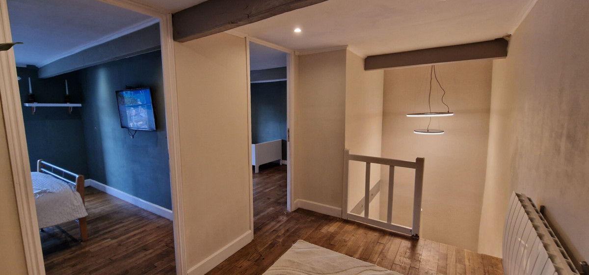De la cuisine, un escalier mène au couloir desservant les deux chambres principales, ainsi qu'au grenier mansardé, utilisée comme une chambre à fini.