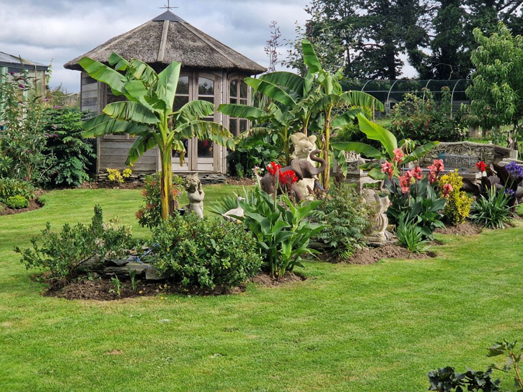 Les jardins paysagés sont un véritable atout. Conçus avec soin, ils comprennent un bassin ornemental, un pavillon d'été, une tente cloche équipée d'un poêle à bois, un container de stockage pratique et quatre accès distincts au terrain. Un espace extérieur parfait pour se détendre, recevoir ou simplement profiter de la nature.