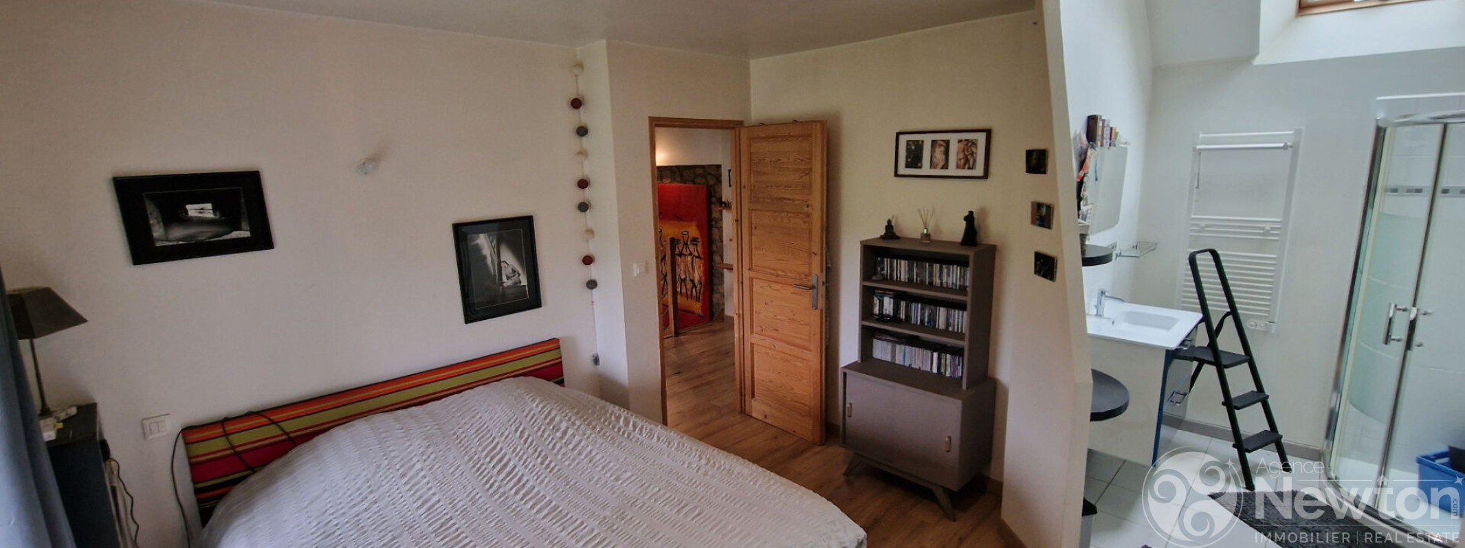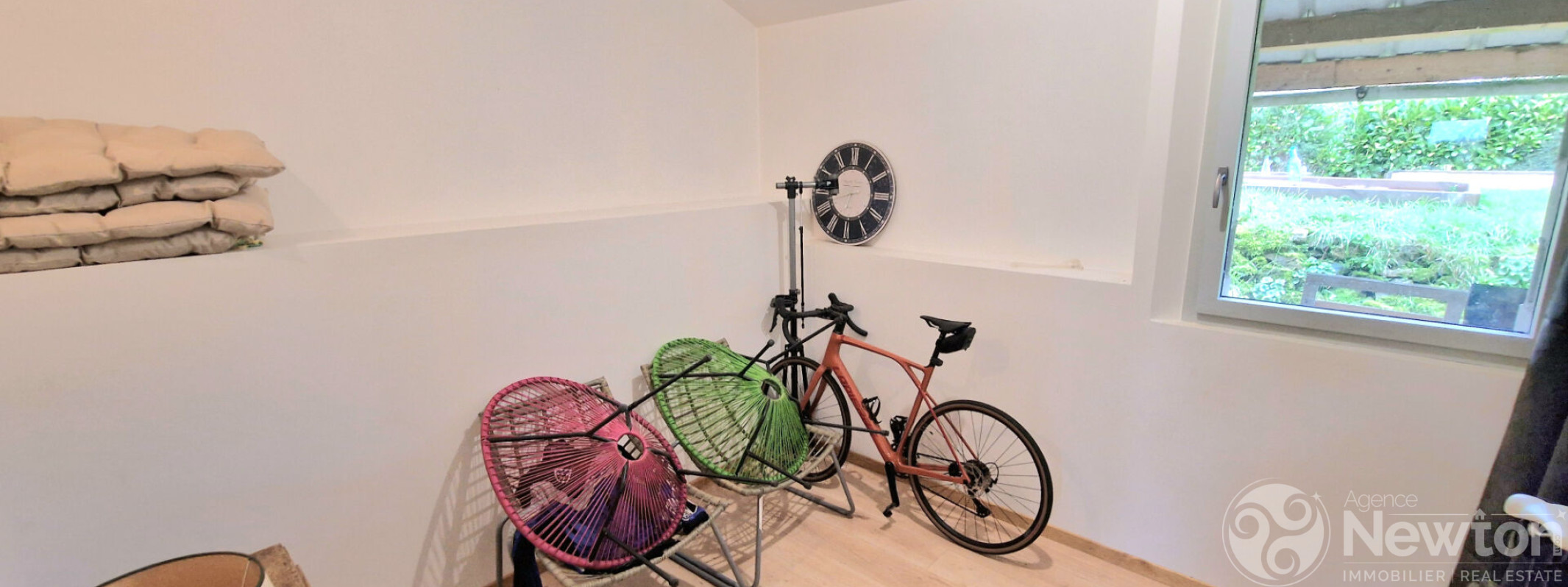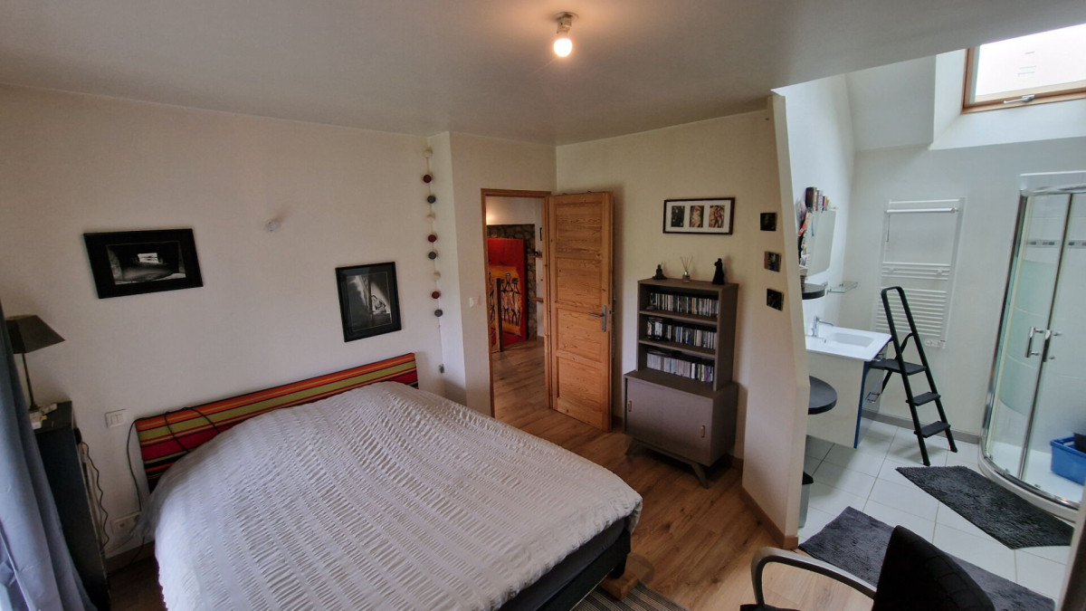 A l'étage, une mezzanine élégante, ouverte et lumineuse fait office de bureau et de coin lecture. On y trouve également une chambre avec dressing et salle de douche privative. La troisième chambre, accessible par un escalier en bois, est dotée d'une grande fenêtre de toit Velux.