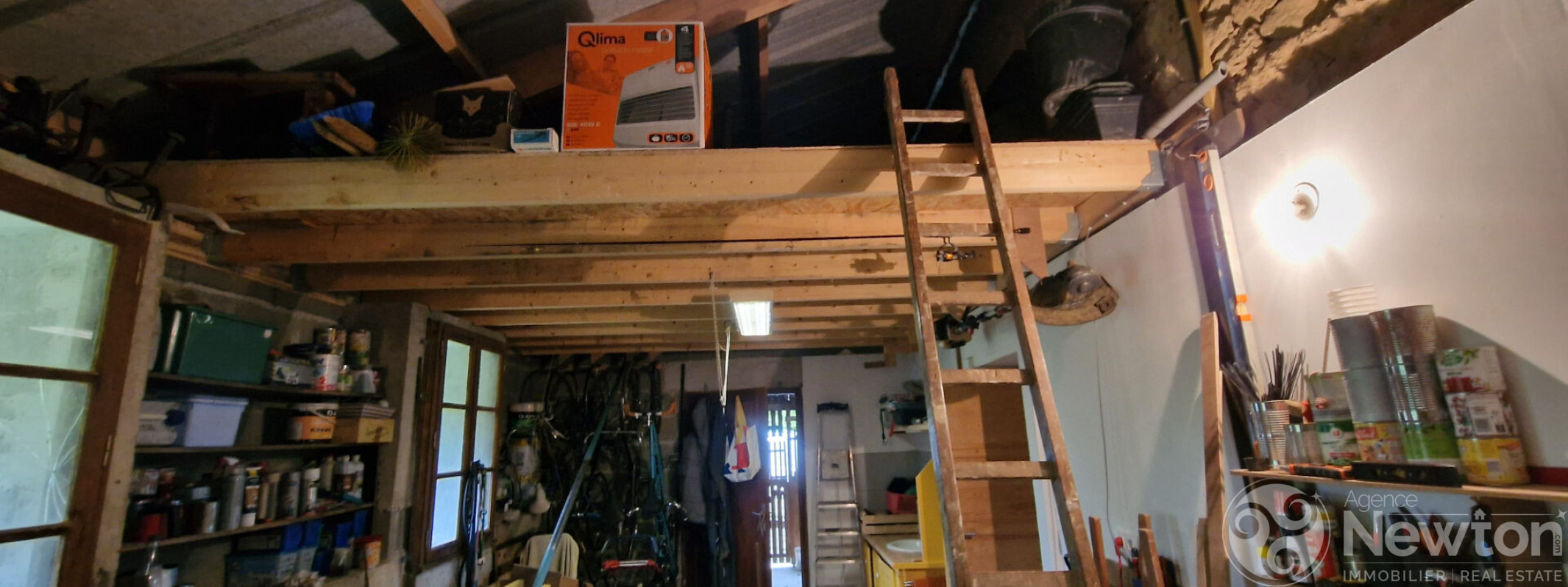 La cuisine équipée, avec buanderie et rangements séparés, est attenante au séjour et une cloison vitrée préserve la luminosité naturelle. Une salle de bains et une chambre complètent cet espace bien agencé, avec un accès facile à l'atelier et au garage.