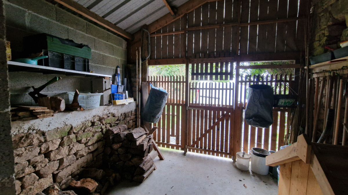 A l'extérieur, un jardin bien entretenu abrite un ancien four à pain en pierre et un puits. Sur le côté, un parking peut accueillir 2 à 3 voitures et donne accès au garage. A l'arrière se trouvent une pelouse, un potager et un espace pour le stockage du bois.