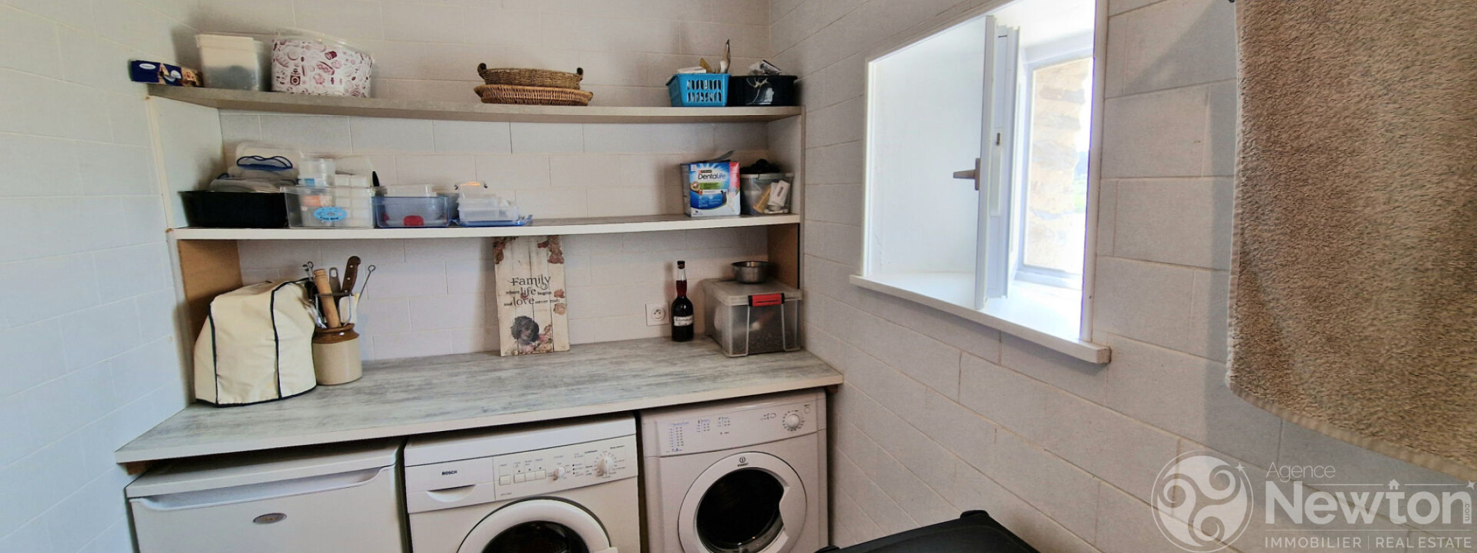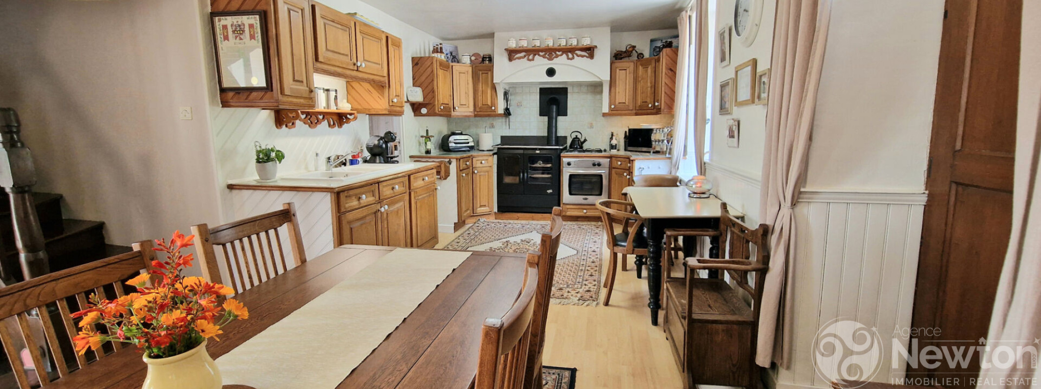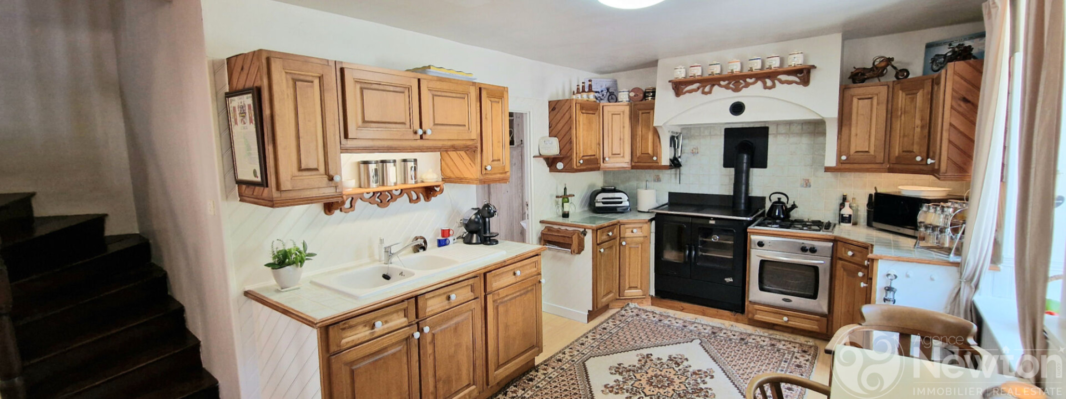 La maison comprend un séjour-cuisine ouvert avec poêle à bois et cuisinière, une buanderie et des toilettes au rez-de-chaussée.