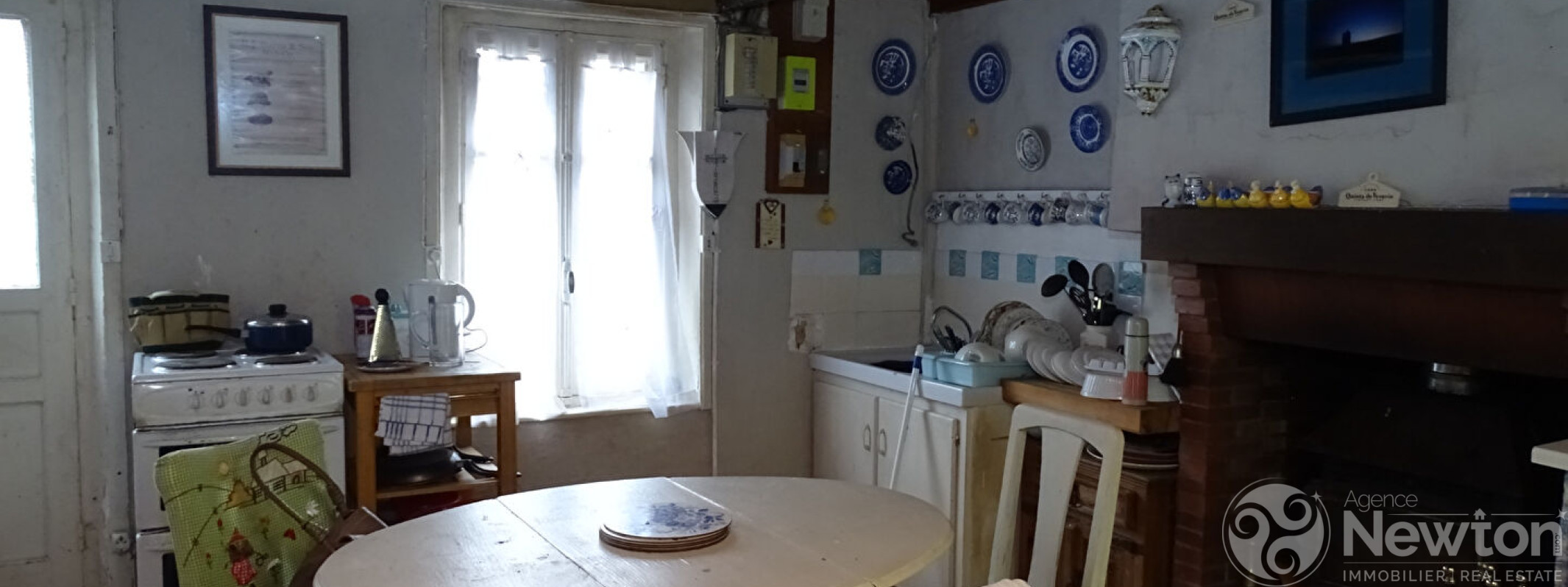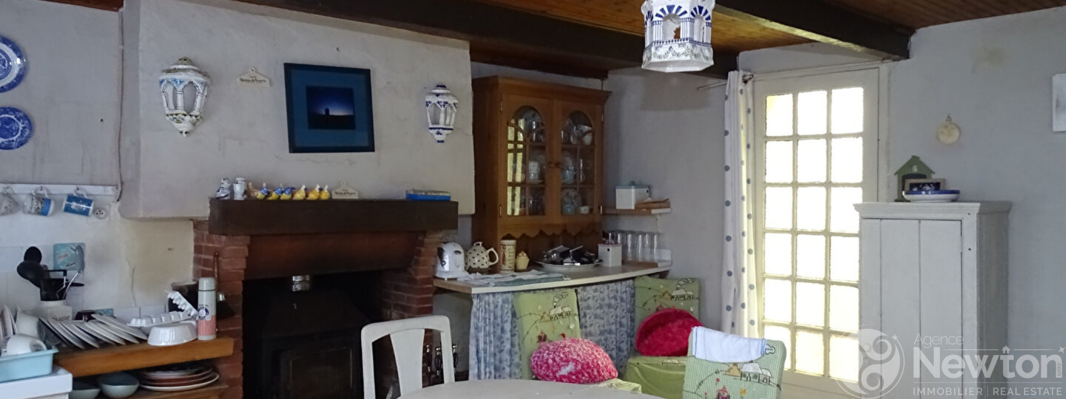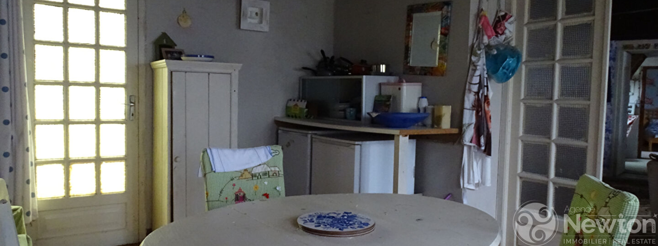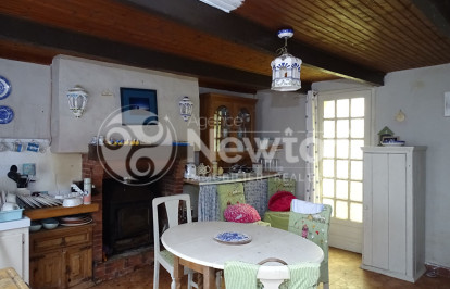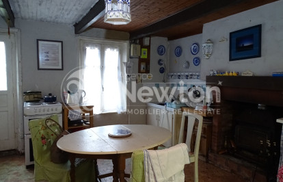 La cuisine est équipée d'un poêle à bois et d'une porte donnant sur le jardin. Ce dernier mène à un salon lumineux grâce à ses fenêtres à double exposition. Un couloir dessert depuis le salon une chambre, une salle de bains et des toilettes séparées.
