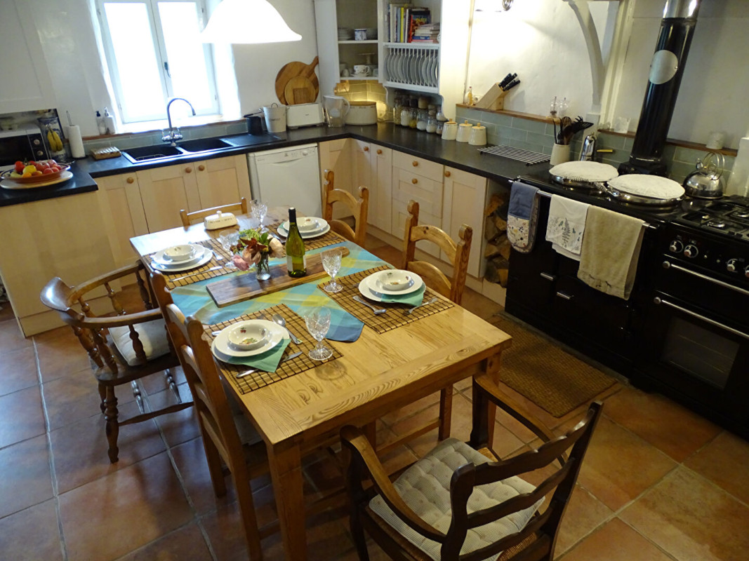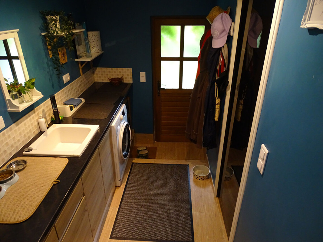 A votre arrivée, vous serez accueilli par une cuisine spacieuse. La maison est équipée d'éléments de cuisine intégrés, d'une cuisinière et d'une cuisinière à bois, garantissant un confort optimal pendant les mois d'hiver. Le salon, adjacent à la cuisine, est pourvu d'un poêle à bois.