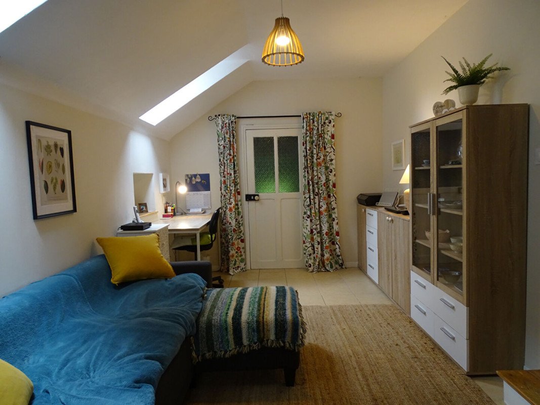 A l'arrière du bien, un espace bureau/salon donne accès à un jardin privé sur la gauche, et l'avant de la maison est accessible. La maison comprend également une buanderie et une salle d'eau avec WC au rez-de-chaussée. La buanderie permet d'accéder au jardin, situé à droite de la maison.