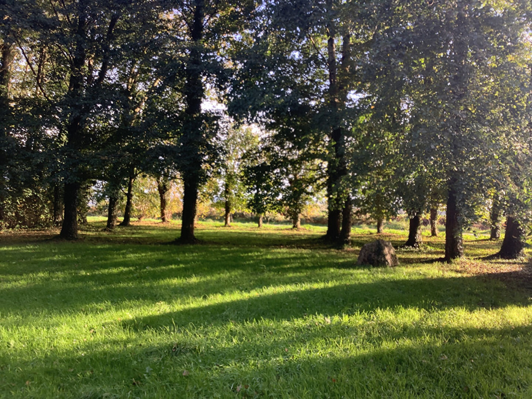 A l'extérieur, le terrain de 7500m2 est tout autour de la maison, divisé en jardin, pelouse et zone boisée, le tout plat.