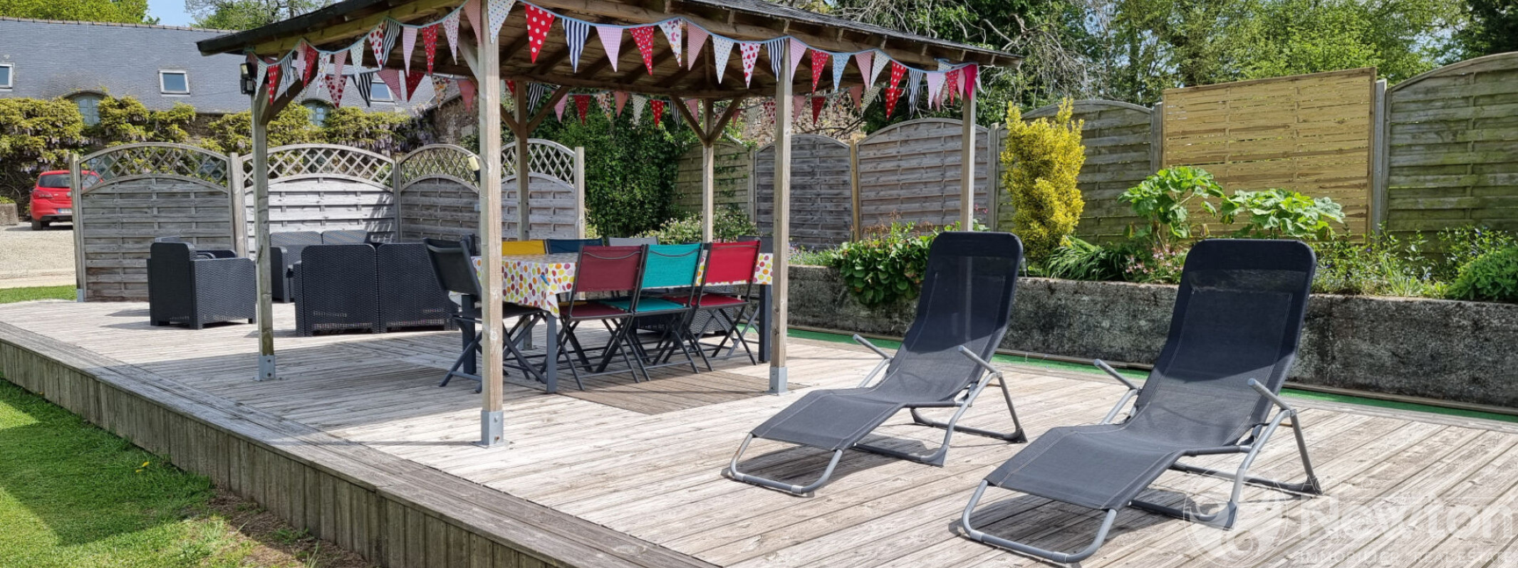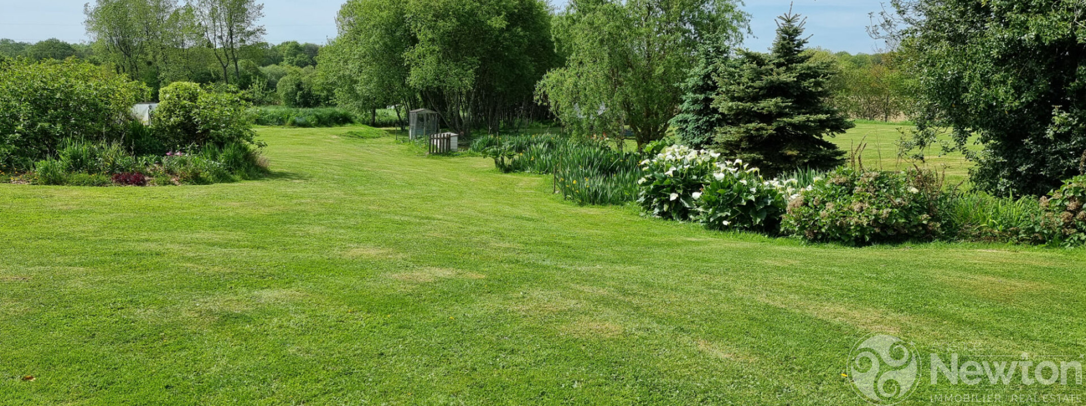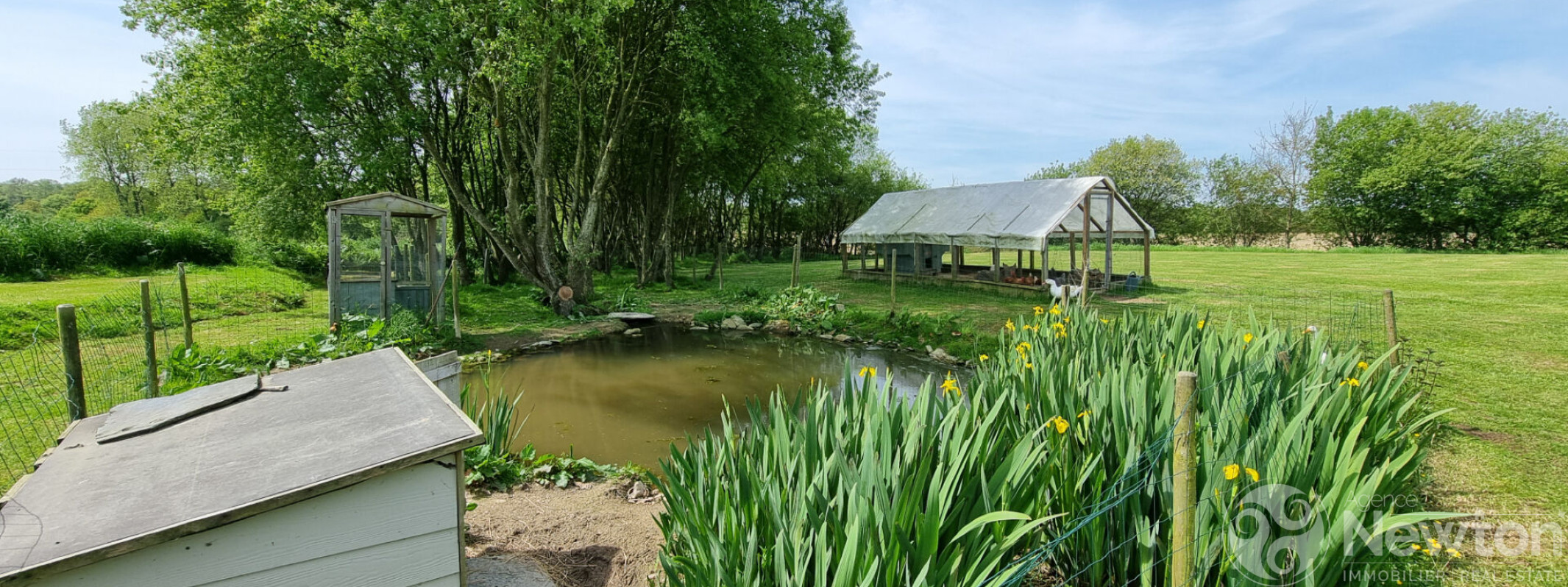 A l'avant, le jardin paysager soigneusement entretenu propose une terrasse en bois menant à la piscine ainsi que quatre bassins d'ornement, venant parfaire ce lieu unique.