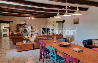 La maison principale, magnifiquement habillée de glycines, domine la cour et propose de beaux volumes de vie. Au rez-de-chaussée, vous trouverez une cuisine entièrement équipée avec arrière-cuisine et poêle à bois, un vaste salon/salle à manger avec un second poêle, une salle d'eau, une salle de bains avec douche et élégante baignoire îlot, ainsi qu'un bureau pouvant faire office de chambre.
