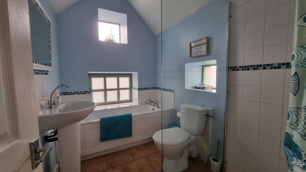 A l'étage, quatre belles chambres doubles et une salle de bains complètent l'ensemble. Le salon permet également d'accéder (avec possibilité de séparation) au cottage d'une chambre, comprenant une pièce de vie ouverte au rez-de-chaussée et, à l'étage, une chambre avec salle d'eau ? idéal pour accueillir famille, amis ou générer un revenu locatif.