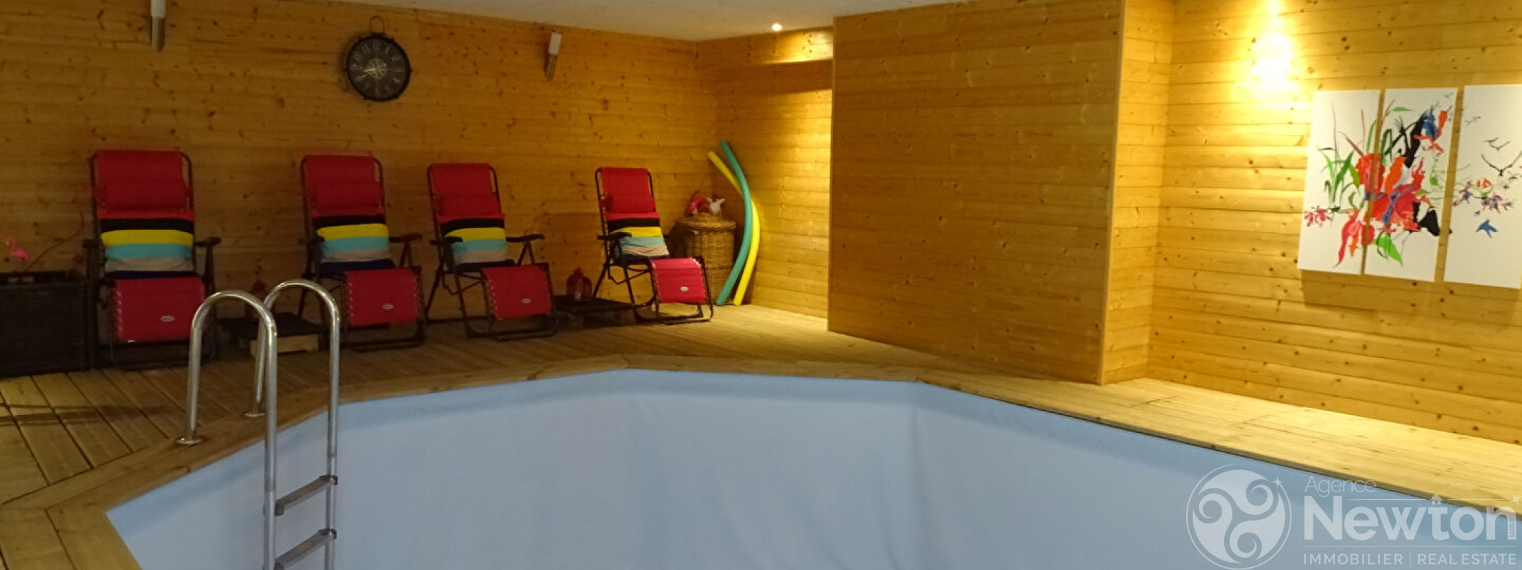 Depuis le hall d'entrée, vous accédez à la salle à manger des invités, dotée de portes-fenêtres donnant sur la terrasse. A côté de la salle à manger se trouve un grand pool house avec une piscine chauffée de 6 m x 4 m. D'une profondeur de 1,3 m, elle est chauffée par une pompe à chaleur aérothermique. Des toilettes avec lave-mains sont également à la disposition des invités.