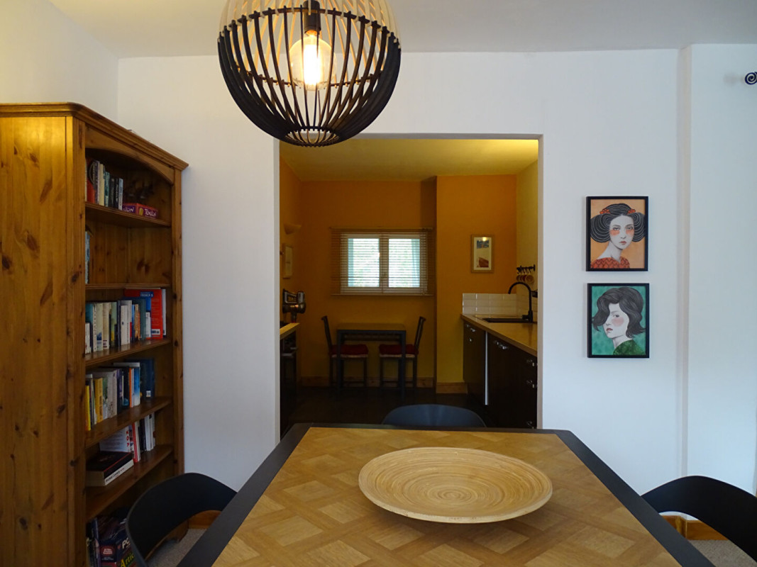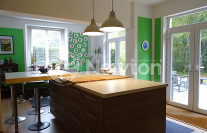 A l'extérieur, une terrasse relie la piscine intérieure au jardin arboré, agrémenté de vignes et d'arbres fruitiers, ainsi que d'une aire de jeux.