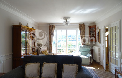 A droite du hall, un grand salon baigné de lumière grâce aux portes-fenêtres donnant sur la façade.