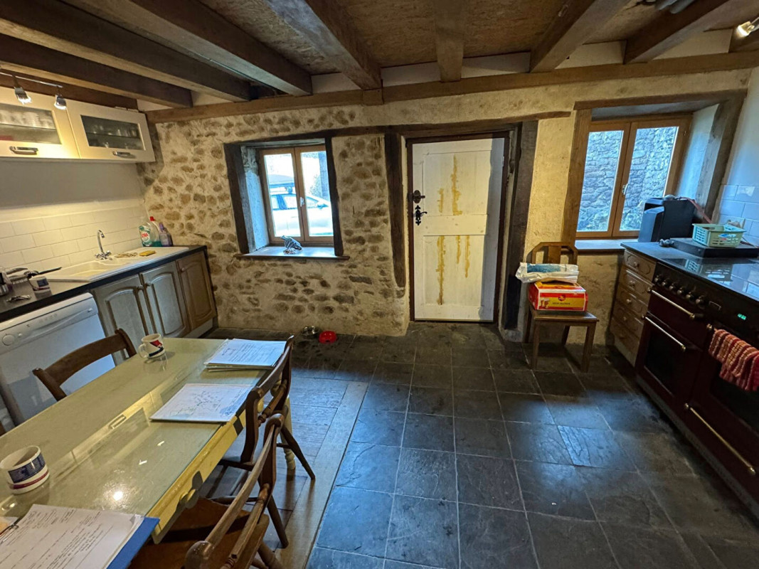 Au rez-de-chaussée, vous trouverez une spacieuse pièce de vie ouverte servant de salon et salle à manger, équipée d'un poêle à bois qui assure le chauffage central et la production d'eau chaude durant les mois d'hiver, ainsi qu'une cuisine.