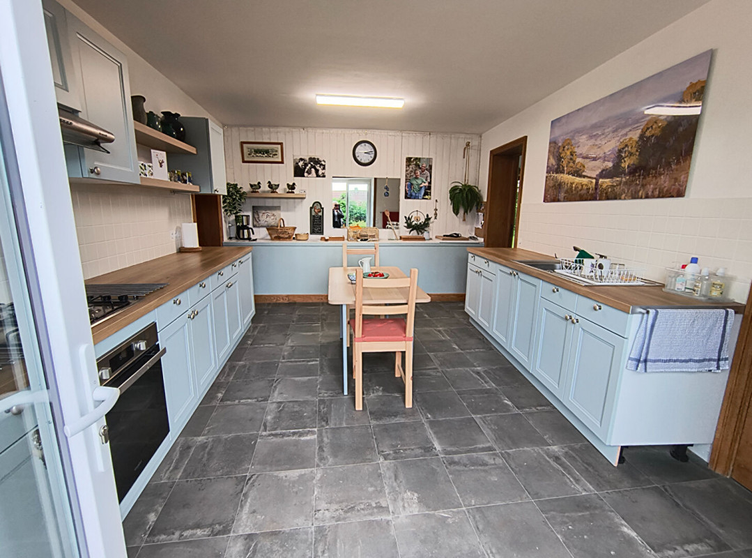 La maison principale se compose au rez-de-chaussée d'un grand espace de vie avec un poêle à bois et des poutres apparentes, d'une belle cuisine équipée, d'un vestiaire avec WC et d'une salle à manger séparée. La salle à manger donne sur un grand jardin d'hiver avec une vue magnifique sur le jardin. La salle à manger donne sur une grande véranda avec une vue magnifique sur le jardin. Elle donne également sur un atelier intégral, un garage et la maison de campagne qui nécessite une rénovation complète. De l'autre côté du salon se trouve une cuisine d'été avec accès à une buanderie.