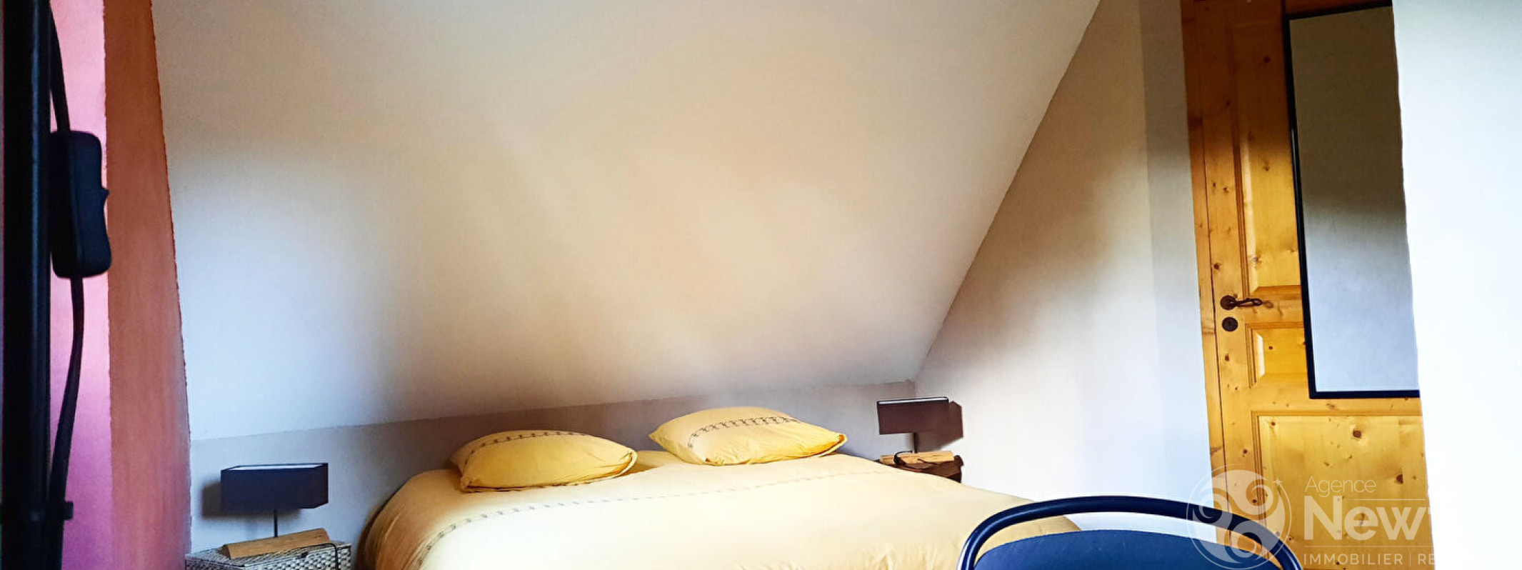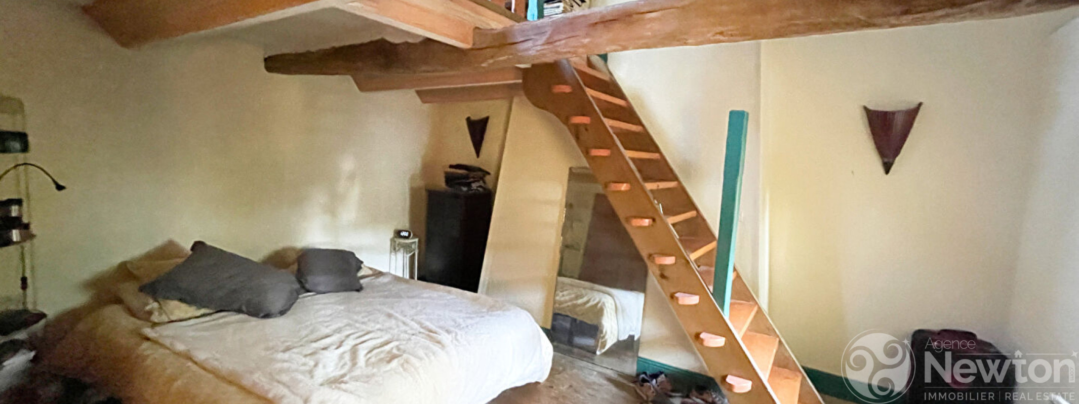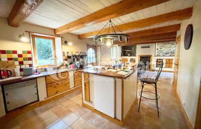 Au rez-de-chaussée, un séjour avec coin cuisine donne accès à des toilettes, un placard de rangement et une petite salle de bains. Un escalier mène à deux chambres, dont l'une dispose d'une mezzanine dans les combles. Depuis le séjour, une véranda s'ouvre sur une grande cuisine/salle à manger avec poêle à bois, des toilettes, une buanderie et une chambre au rez-de-chaussée, ce qui est pratique pour recevoir ou vivre de plain-pied.