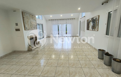 Vous entrez dans la maison par un hall d'entrée, qui donne sur un salon extrêmement spacieux et une cuisine séparée. Depuis le salon et la cuisine, vous pouvez accéder à la piscine par des portes-fenêtres. Un long couloir part du hall d'entrée et mène au garage et à la véranda. Il mène également à trois chambres doubles, dont l'une dispose d'une salle de douche attenante. Il est également possible d'accéder à la piscine depuis deux des chambres par des portes-fenêtres. Il y a également une grande salle de bains avec deux lavabos, une baignoire spa et des toilettes séparées.