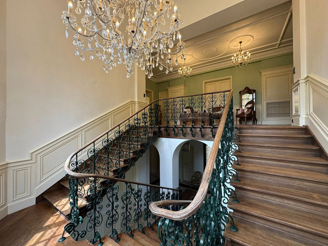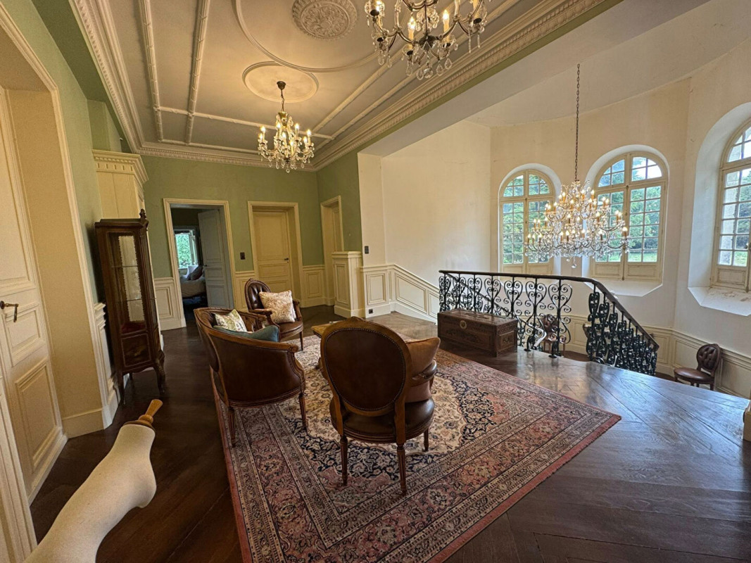 Le château se découvre au bout d'une longue allée bordée d'arbres et franchie par des grilles majestueuses en fer forgé, prélude à l'élégance des lieux. Le hall d'entrée, lumineux et accueillant, mène à une succession de pièces raffinées et spacieuses : un salon formel, un second salon pouvant servir de salle à manger, un coin bibliothèque et un bureau, tous baignés de lumière naturelle. La salle à manger, avec vue sur le parc, s'ouvre sur l'ancienne tour de service, désormais aménagée en passage vers une cuisine spectaculaire, luxueuse et baignée de lumière, parfaite pour la vie quotidienne comme pour recevoir.