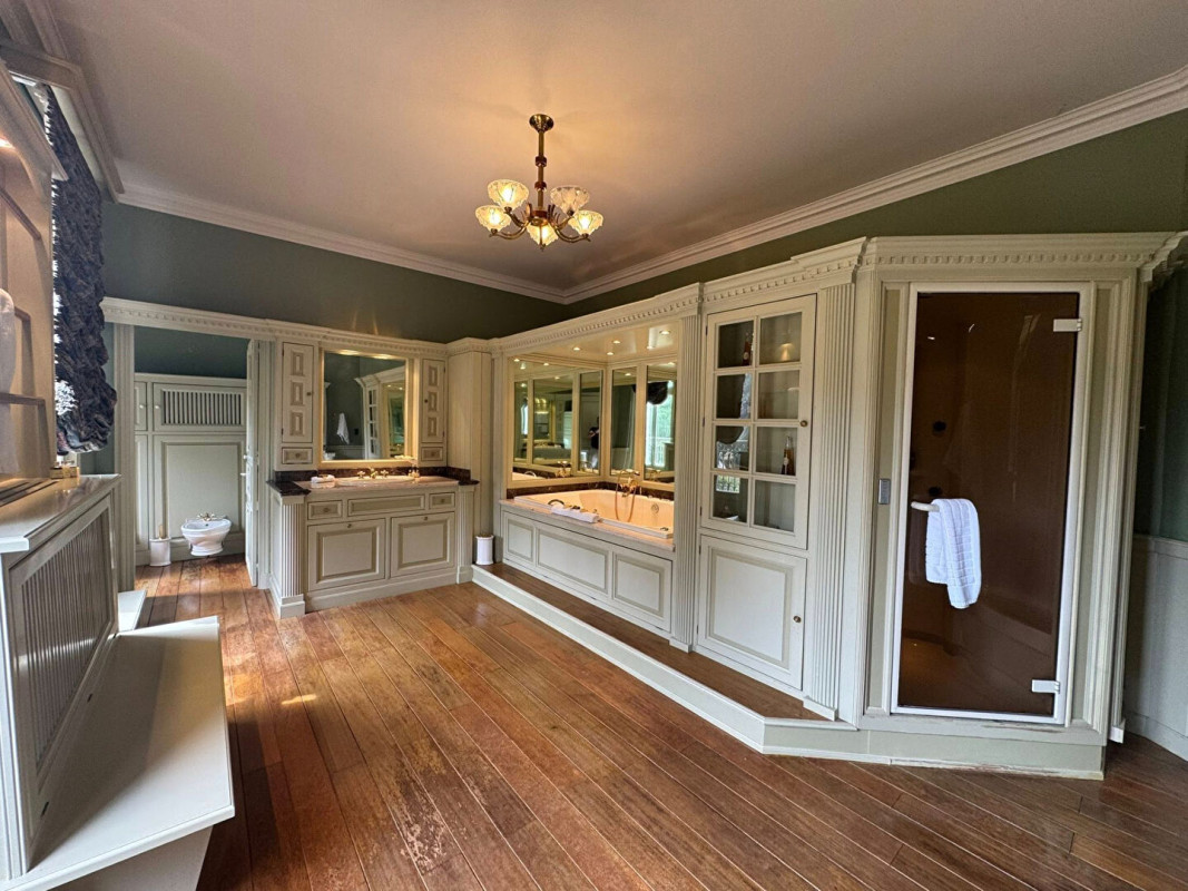 Pour ce faire, des artisans polonais hautement qualifiés ont été invités à vivre et à travailler sur place pendant plus de deux ans, restaurant minutieusement chaque détail architectural. Leur savoir-faire est visible dans chaque recoin de la propriété, depuis l'imposant escalier double jusqu'au dressing sur mesure de la suite parentale, en passant par la cuisine artisanale spectaculaire, équipée d'un piano de cuisson somptueux et d'une crédence finement décorée. Le château offre désormais une harmonie parfaite entre le faste historique et le confort moderne.