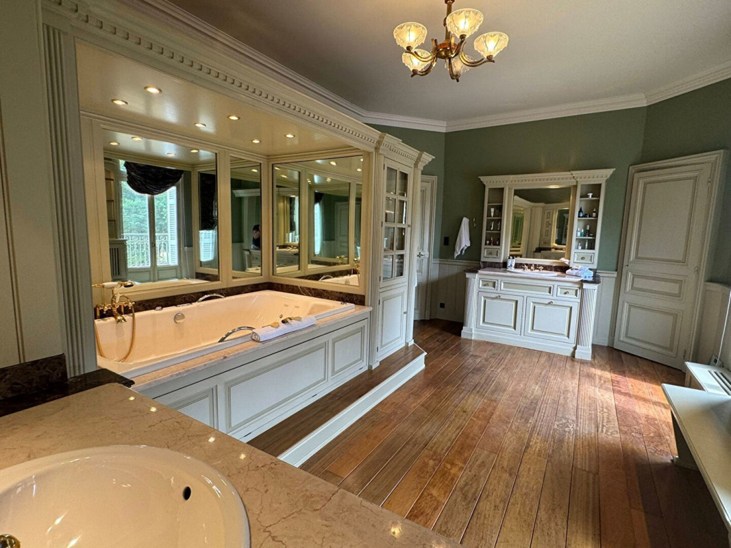 En montant le majestueux escalier double, on découvre un large palier baigné de soleil, surplombé d'un lustre en cristal. Un coin lecture paisible y invite à la détente ou à savourer un verre de vin au coucher du soleil. Ce niveau comprend deux chambres avec salle de bains privative, ainsi qu'une somptueuse suite parentale. Véritable cocon, cette suite dispose d'un dressing sur mesure, d'une pièce de maquillage aménagée dans la tour, et d'une salle de bains spectaculaire avec douche à l'italienne et baignoire jacuzzi, offrant une vue imprenable sur le parc.