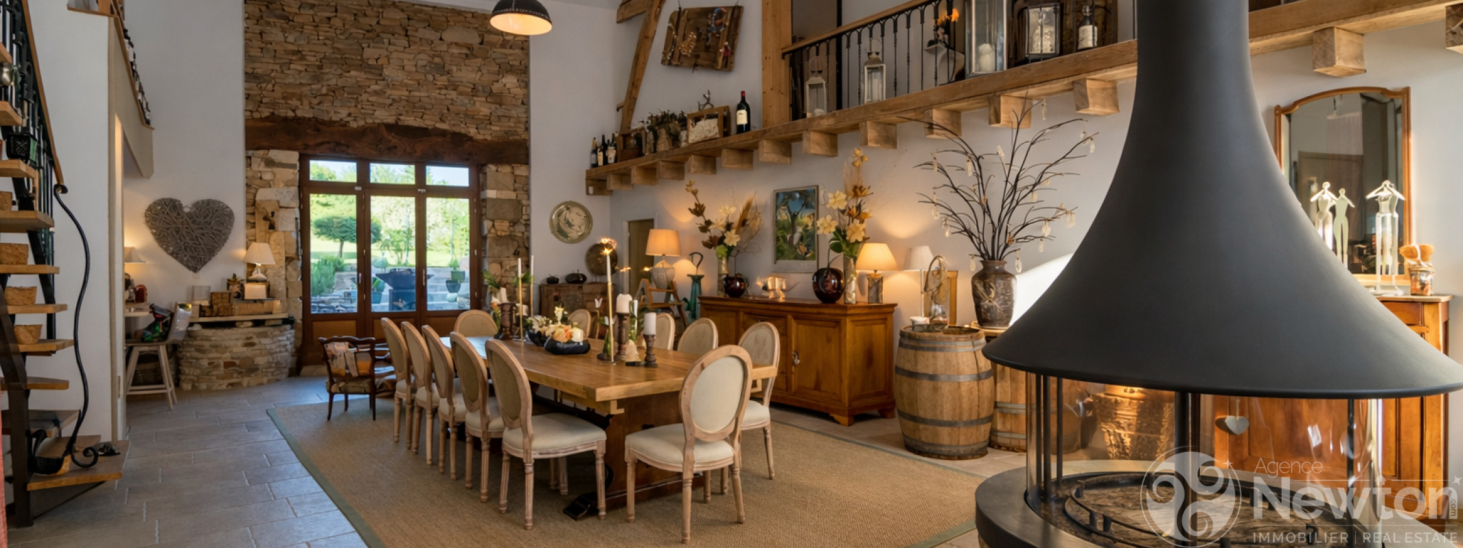 Depuis la salle à manger, de larges portes-fenêtres ouvrent sur une agréable terrasse bien exposée, parfaite pour les repas en extérieur et les moments de convivialité.