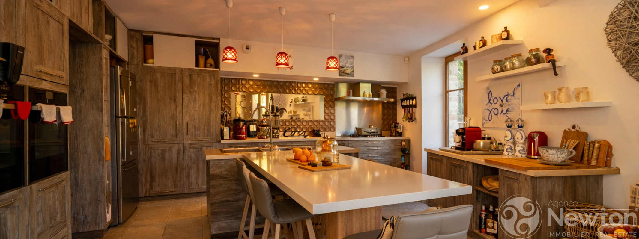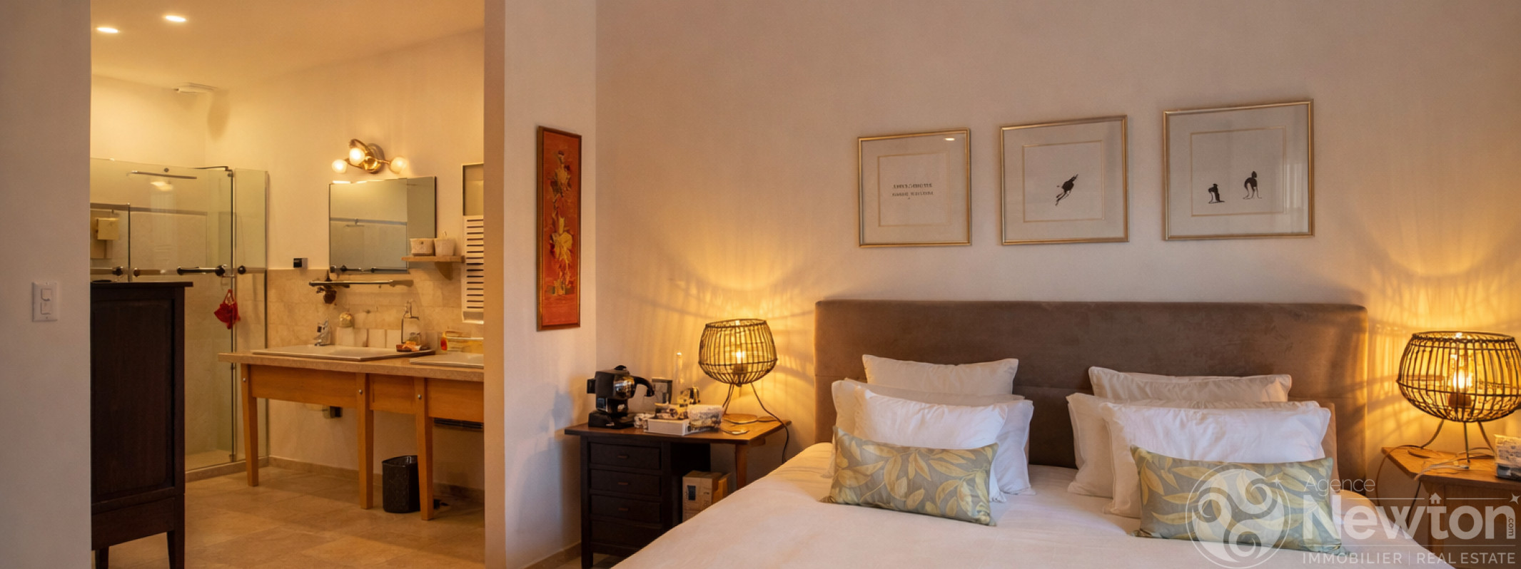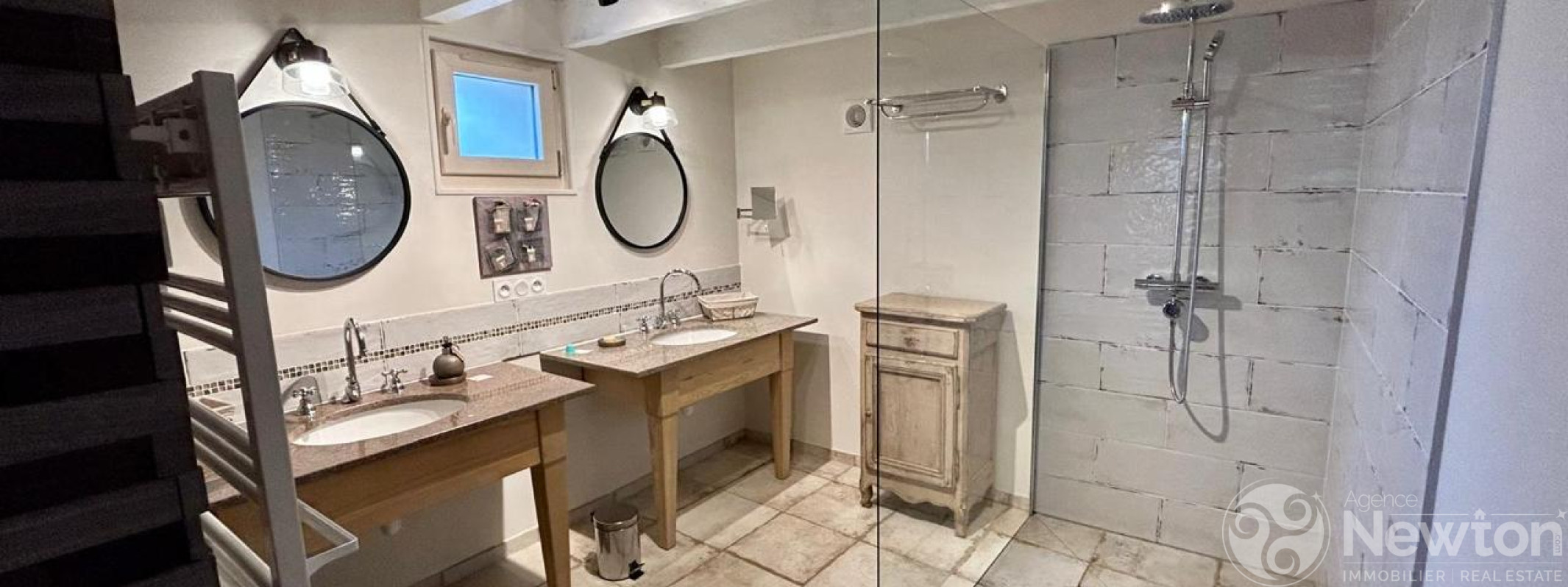 La maison principale développe environ 285 m² habitables. En rez-de-chaussée, elle propose une vaste pièce de vie d'environ 80 m² avec poêle à bois central vitré constituant le point focal du séjour, une cuisine entièrement équipée avec arrière-cuisine, un WC et une chaufferie. Ce niveau comprend également deux belles chambres disposant chacune de leur salle de bains privative et dressing. Une cave à vin climatisée vient parfaire l'ensemble et séduira les amateurs.