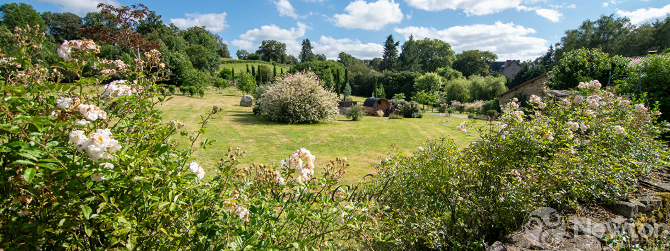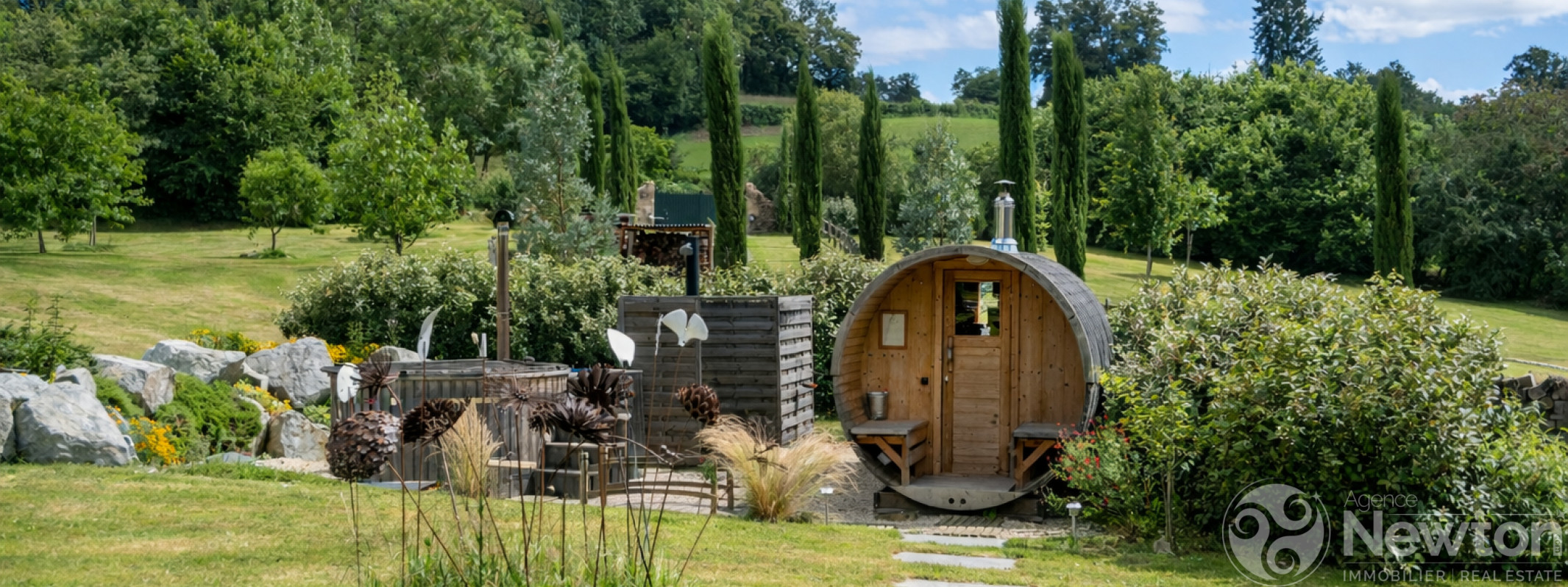 Le terrain de plus d'un hectare est clos et joliment arboré, planté d'essences variées créant un cadre naturel et paisible. Une terrasse avec sauna, à l'abri des regards, permet de profiter pleinement de la tranquillité des lieux.