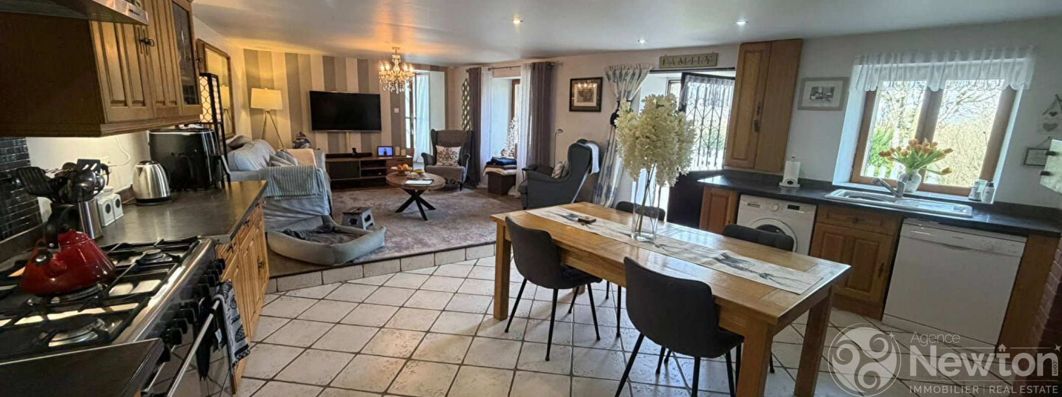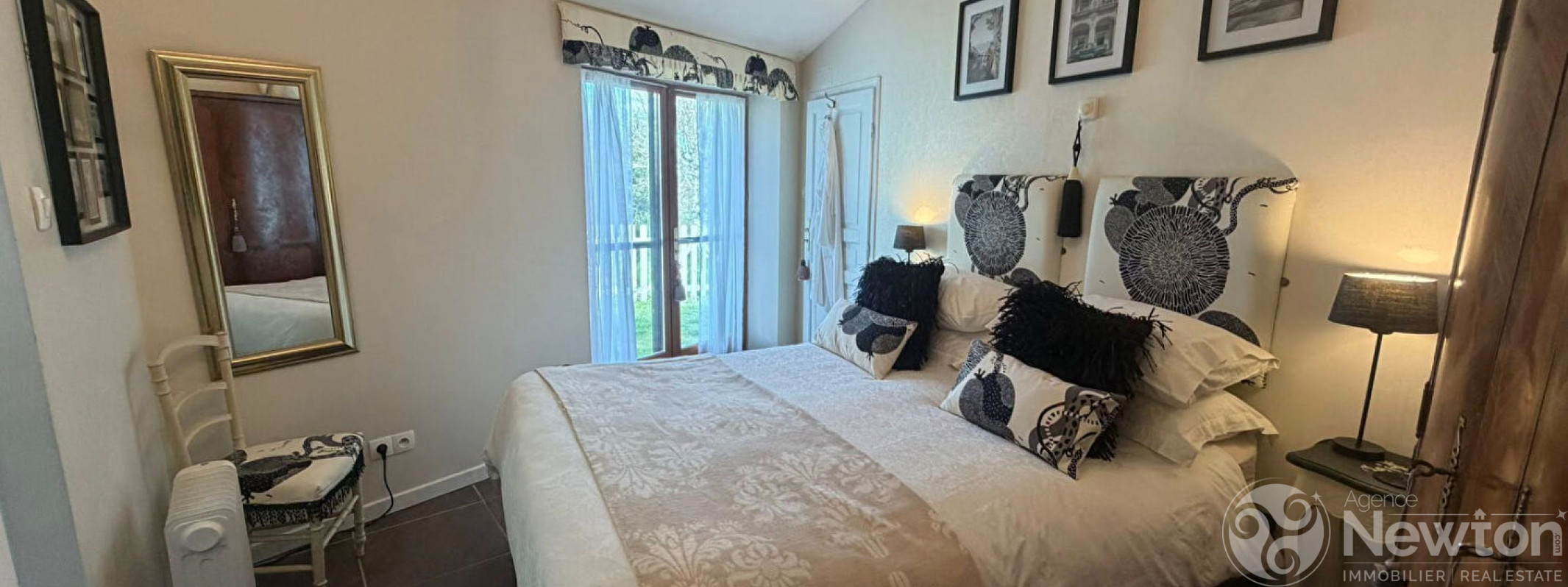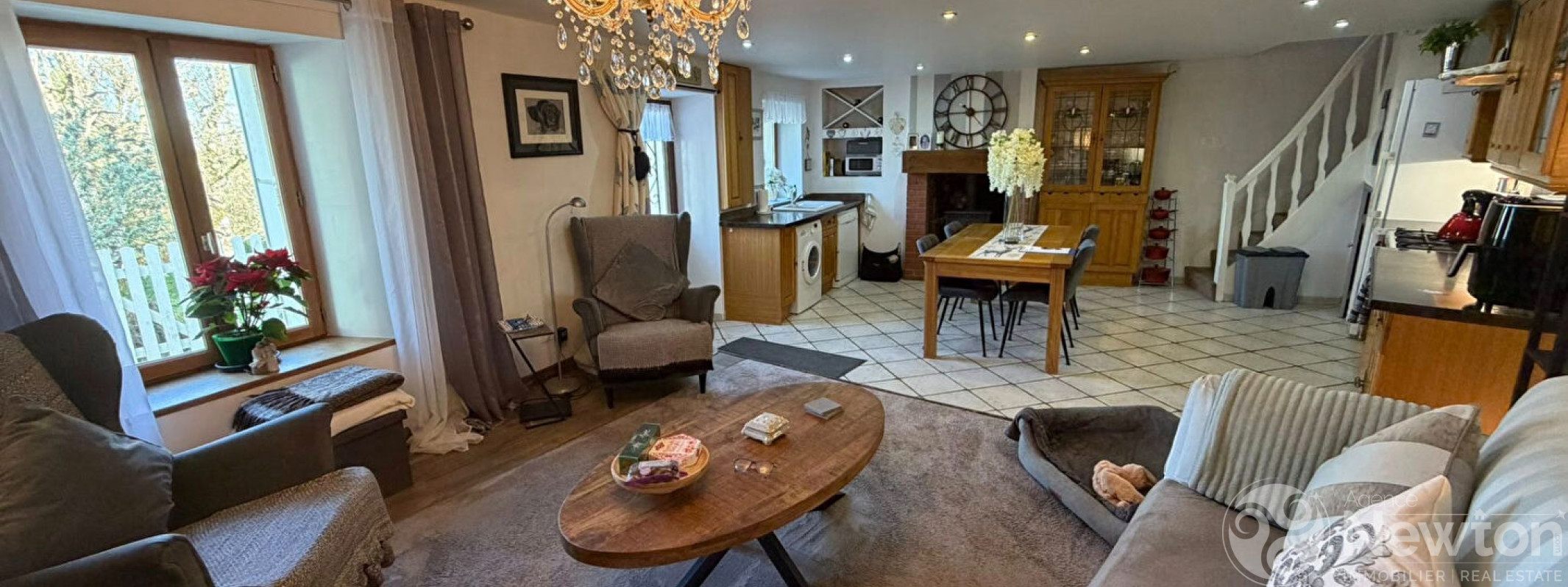 La maison se compose au rez-de-chaussée d'une spacieuse pièce de vie lumineuse avec salon, salle à manger et cuisine ouverte entièrement équipée, agrémentée d'un poêle à bois, ainsi que d'une chambre double avec salle d'eau privative. A l'étage, vous trouverez deux belles chambres doubles et une salle de bains familiale. Raccordée au tout-à-l'égout et équipée de double vitrage, la rénovation intérieure a été réalisée avec goût : il ne reste plus qu'à poser vos valises.