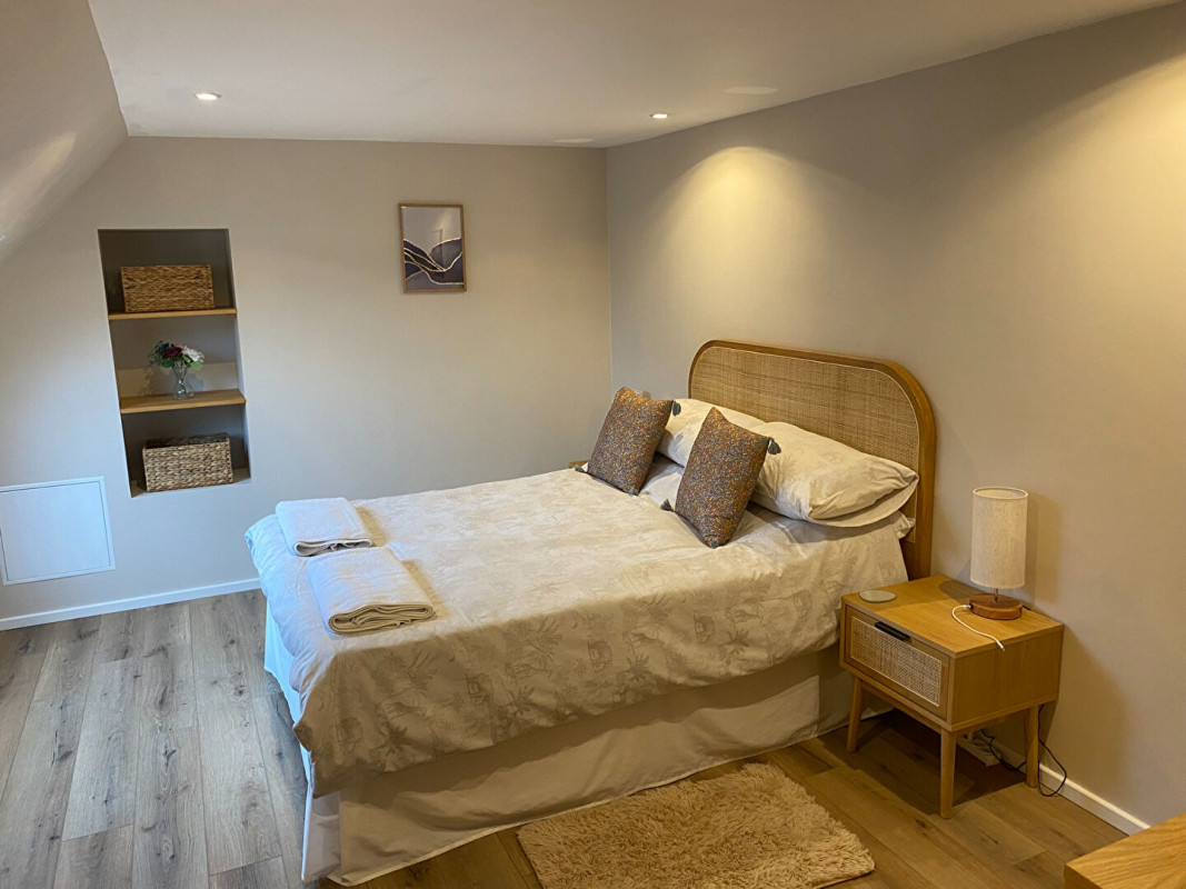 Entièrement rénové et vendu meublé et équipé, ce gîte comprend un grand espace de vie ouvert, une cuisine et une salle à manger au rez-de-chaussée, avec des portes-fenêtres donnant sur une terrasse ensoleillée et un accès à la piscine. Au premier étage, il y a deux chambres et une salle de bains familiale.