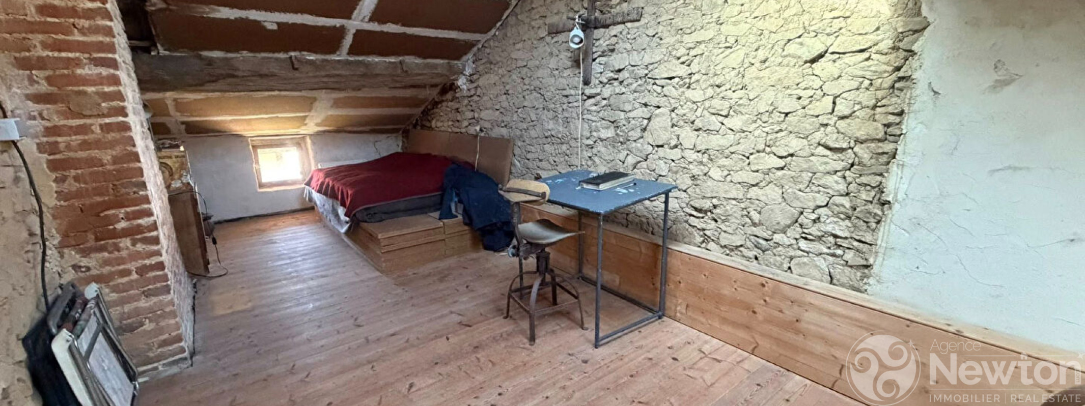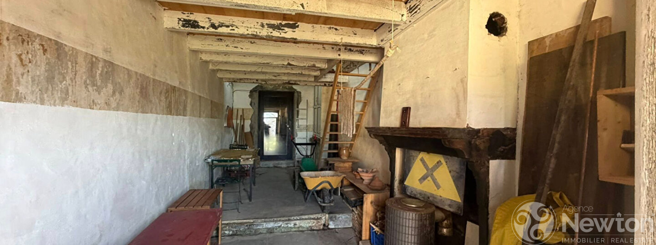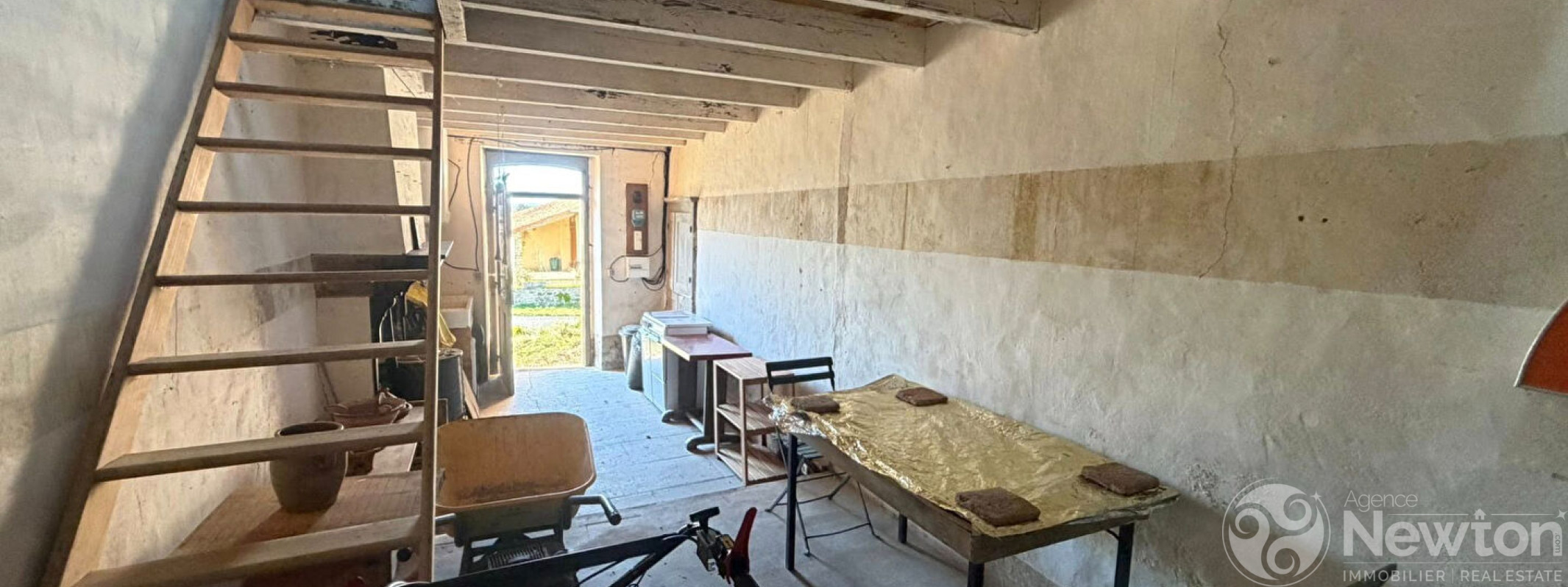 La maison comprend au RDC une seule pièce de vie avec un coin cuisine, une cheminée ouverte, puis un escalier de bois dessert le 1er étage sous les toits où se trouve une chambre. Pas de sanitaires (WC ou Salle d'eau).