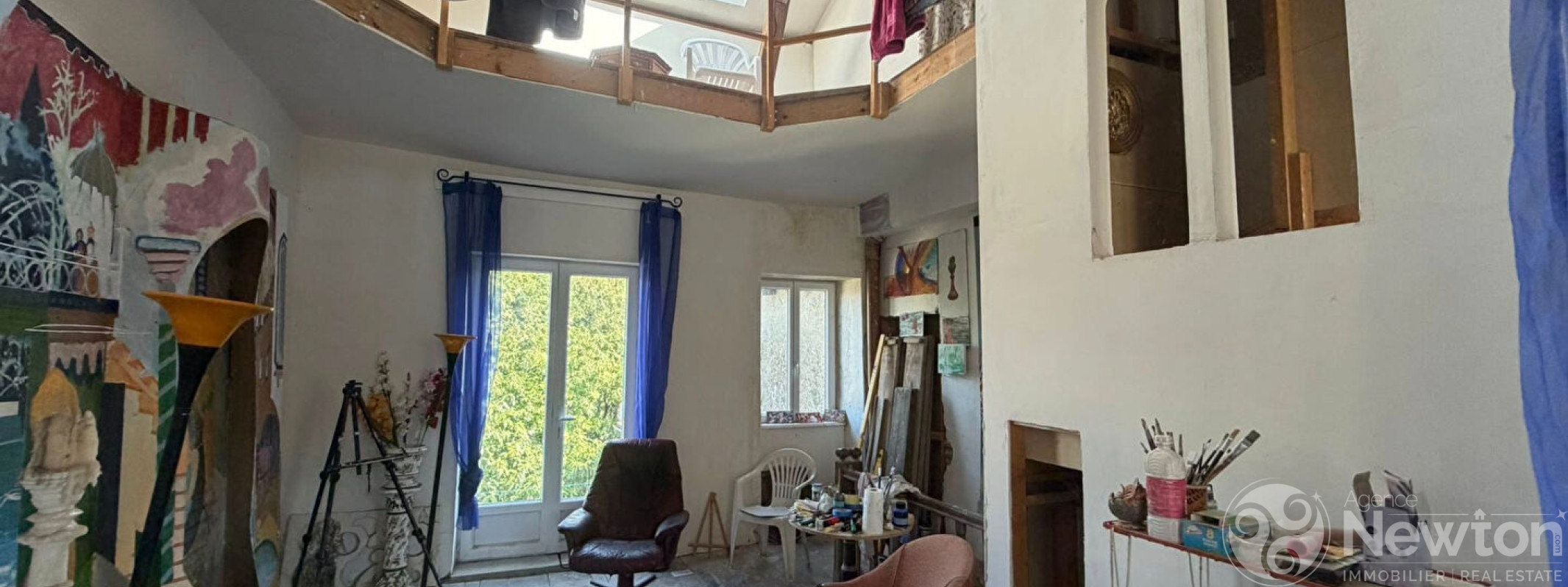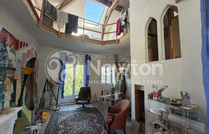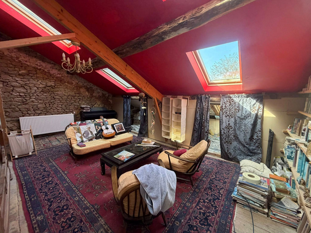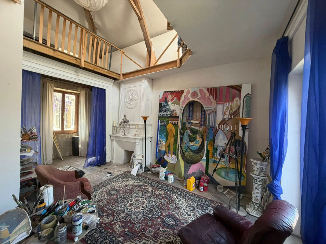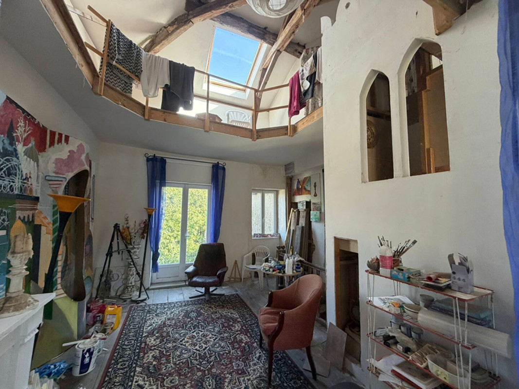 Les étages offrent quatre chambres réparties sur deux niveaux, une mezzanine surplombant un atelier d'artiste, un espace salon commun, des volumes permettant l'aménagement de trois chambres supplémentaires ainsi qu'une salle de bains.