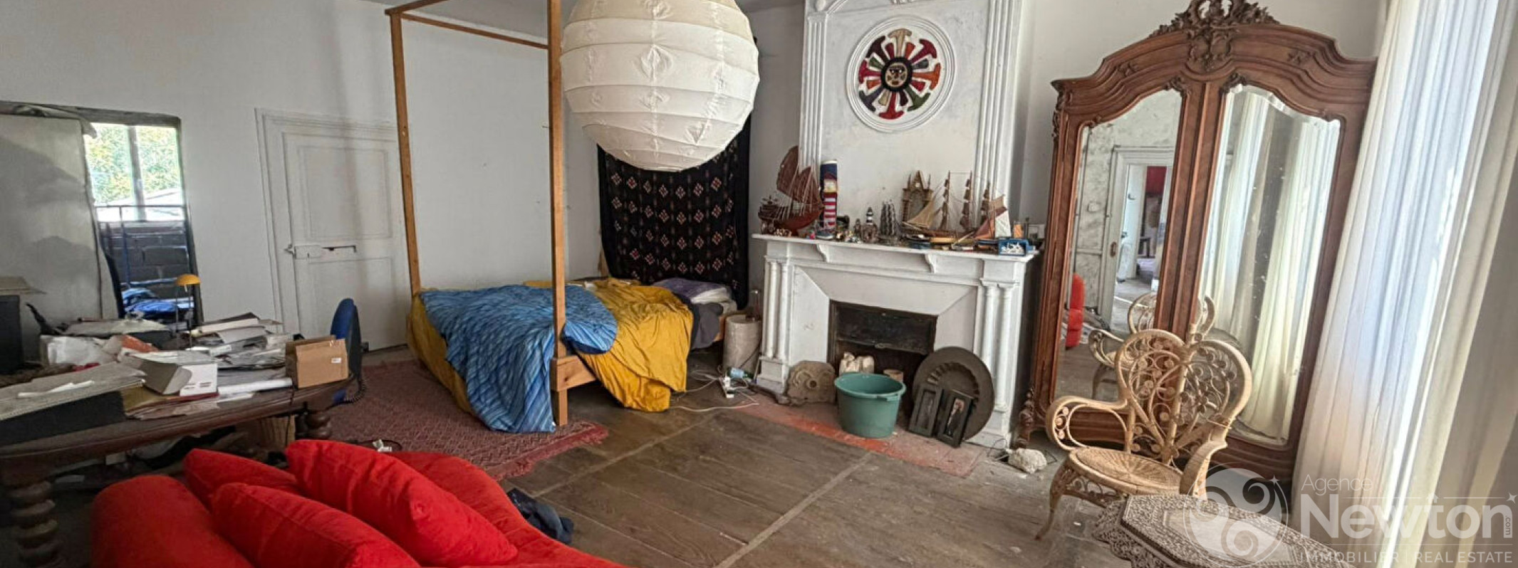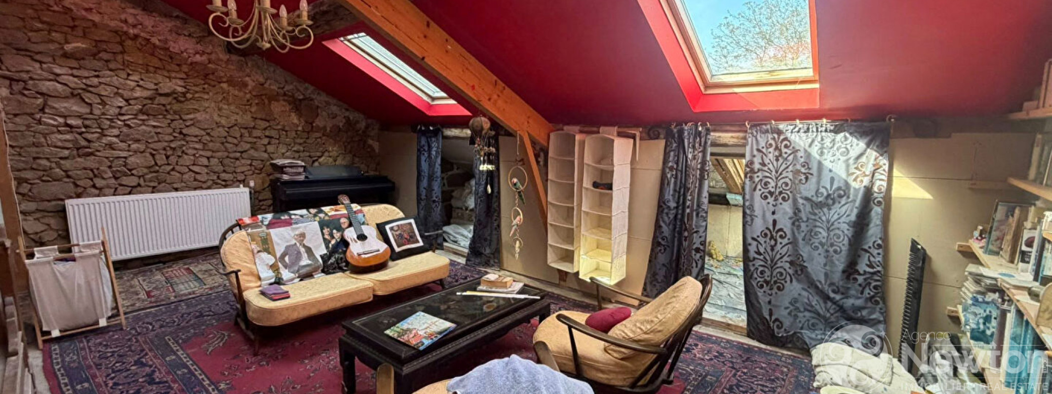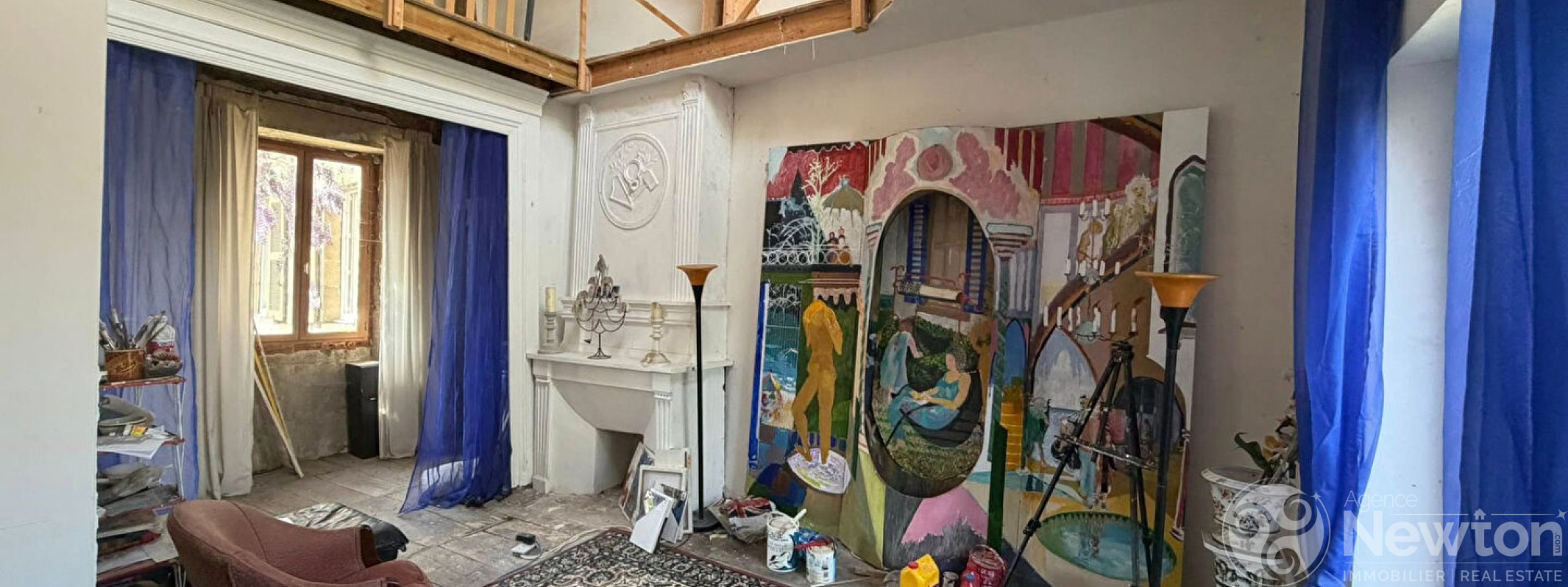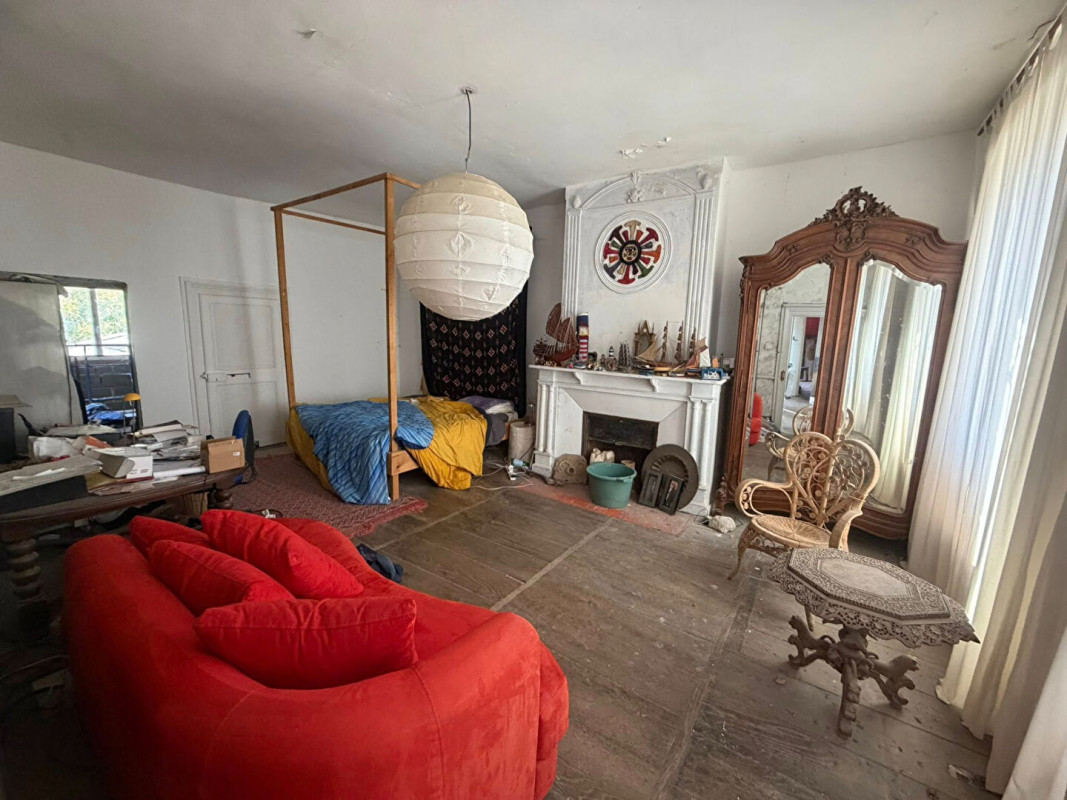 Les étages offrent quatre chambres réparties sur deux niveaux, une mezzanine surplombant un atelier d'artiste, un espace salon commun, des volumes permettant l'aménagement de trois chambres supplémentaires ainsi qu'une salle de bains.