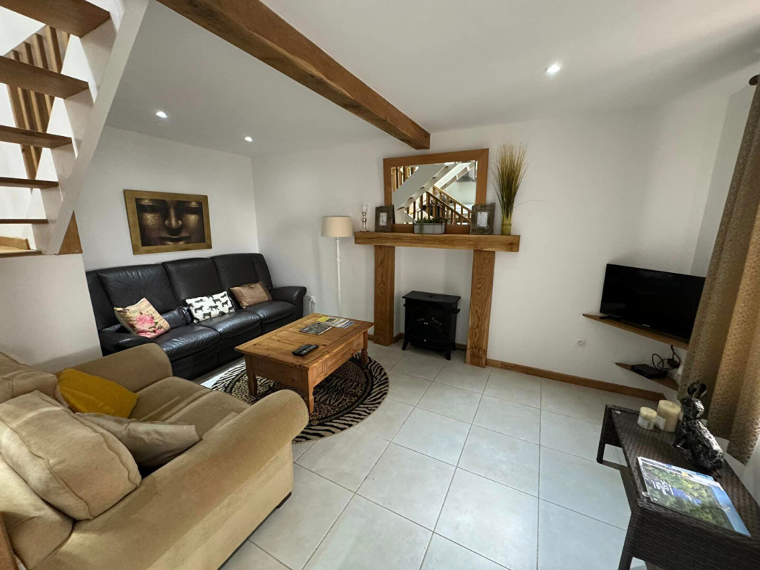 Le gîte se compose au rez-de-chaussée d'un grand salon - salle à manger - cuisine équipée avec un double escalier très inhabituel et unique menant à chacune des 2 chambres avec salle de bains. A l'extérieur du gîte se trouve une terrasse ensoleillée, une piscine hors sol avec une terrasse construite.