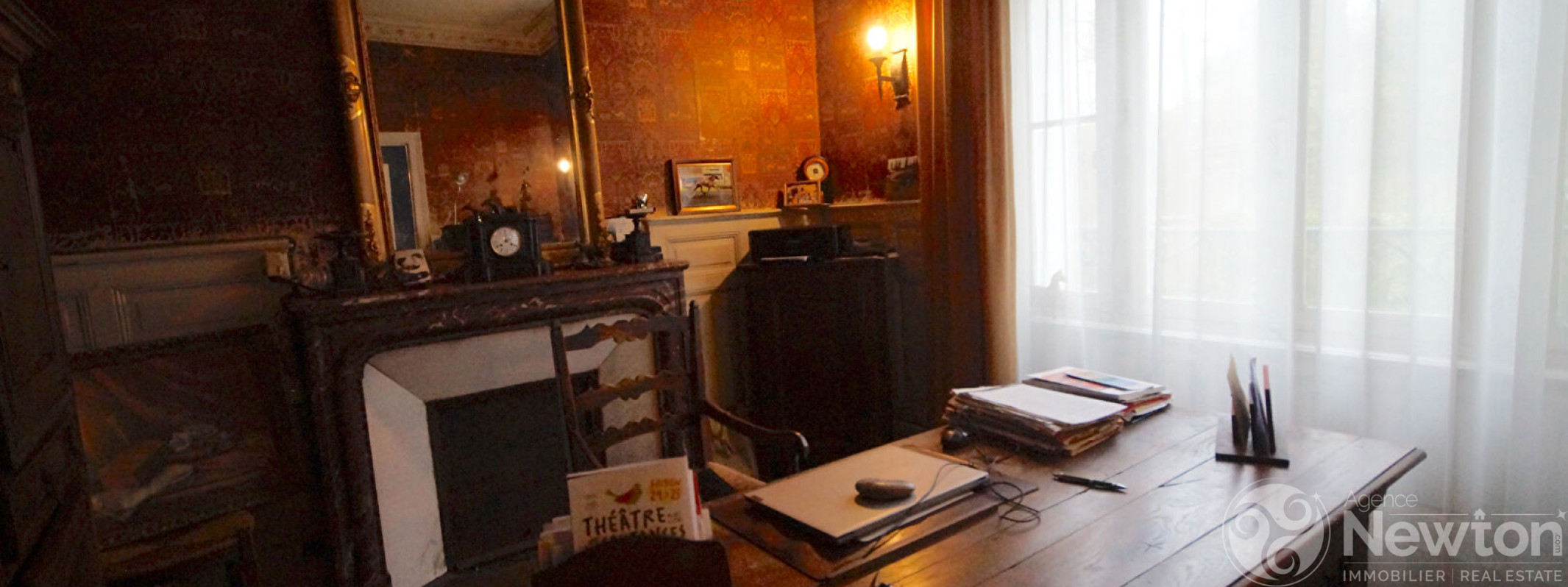 Rez-de-chaussée : Hall d'entrée, cuisine équipée, bureau avec cheminée en marbre, salon ouvrant sur la salle à manger, WC.