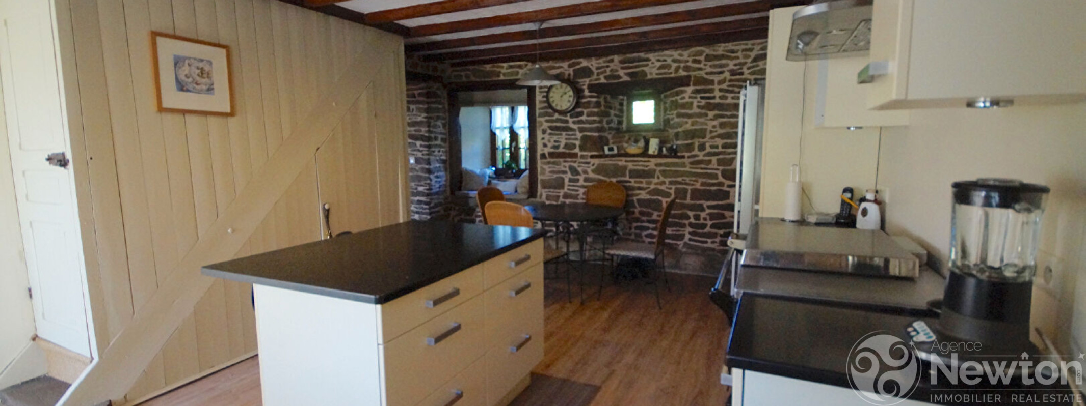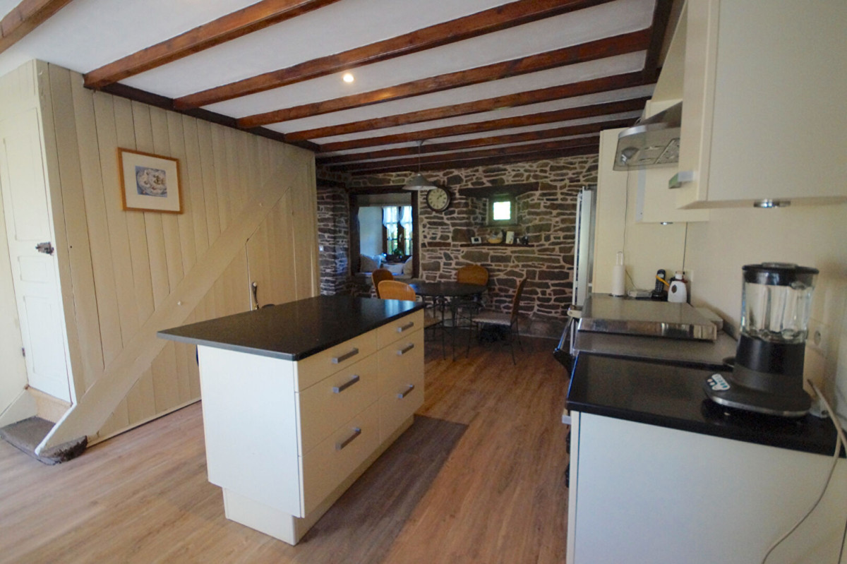 Grande cuisine entièrement équipée avec meubles hauts et bas, double exposition, murs en pierre apparente, bar pour petit-déjeuner et porte donnant sur le jardin avant.
