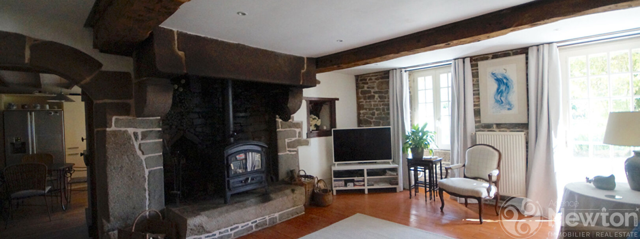 Une arche en pierre mène au salon, avec cheminée en granit et poêle à bois, murs partiellement en pierre apparente, poutres, porte donnant sur l'avant.