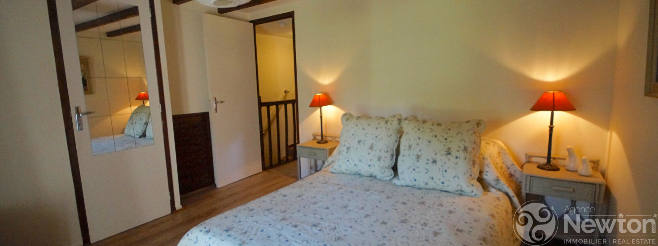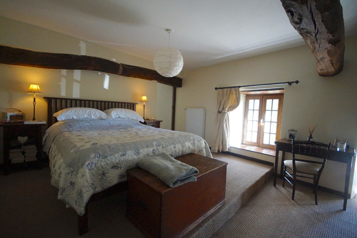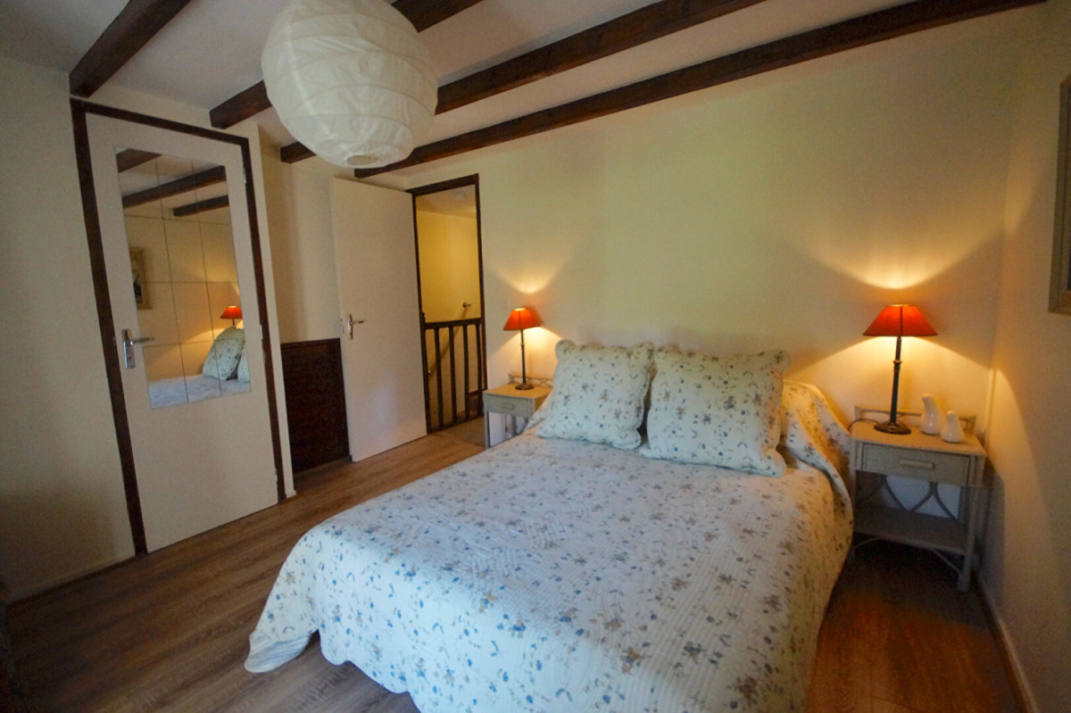 Chambre principale en demi-niveau, avec placards intégrés, poutres apparentes et salle de bains privative comprenant baignoire, lavabo, bidet et WC.
