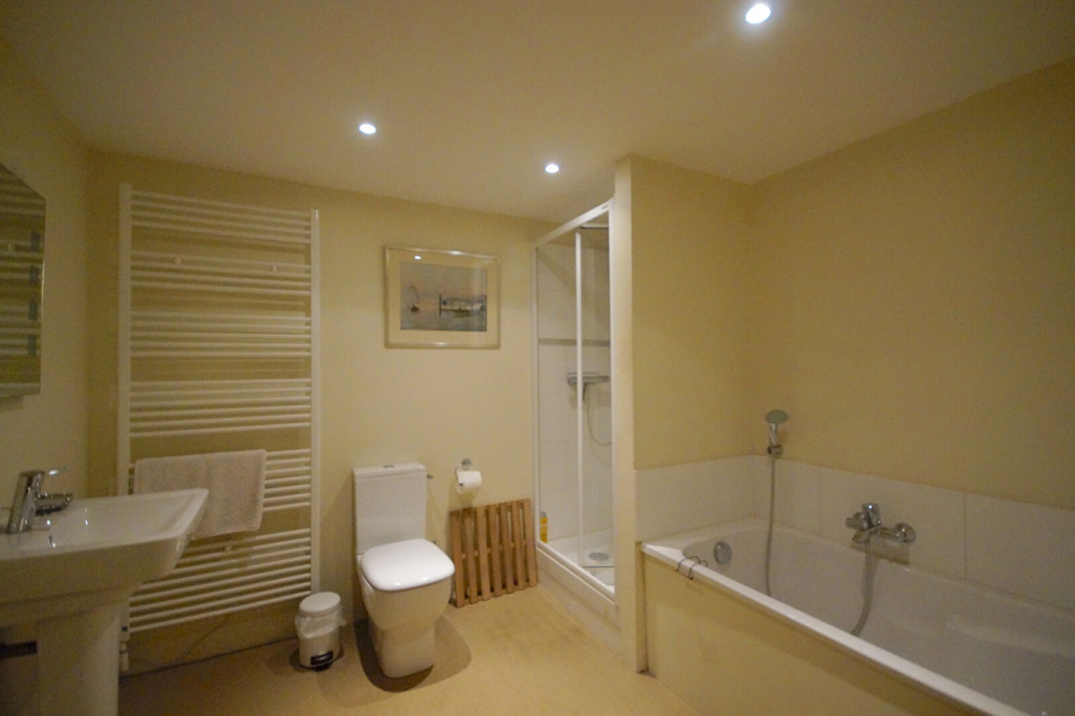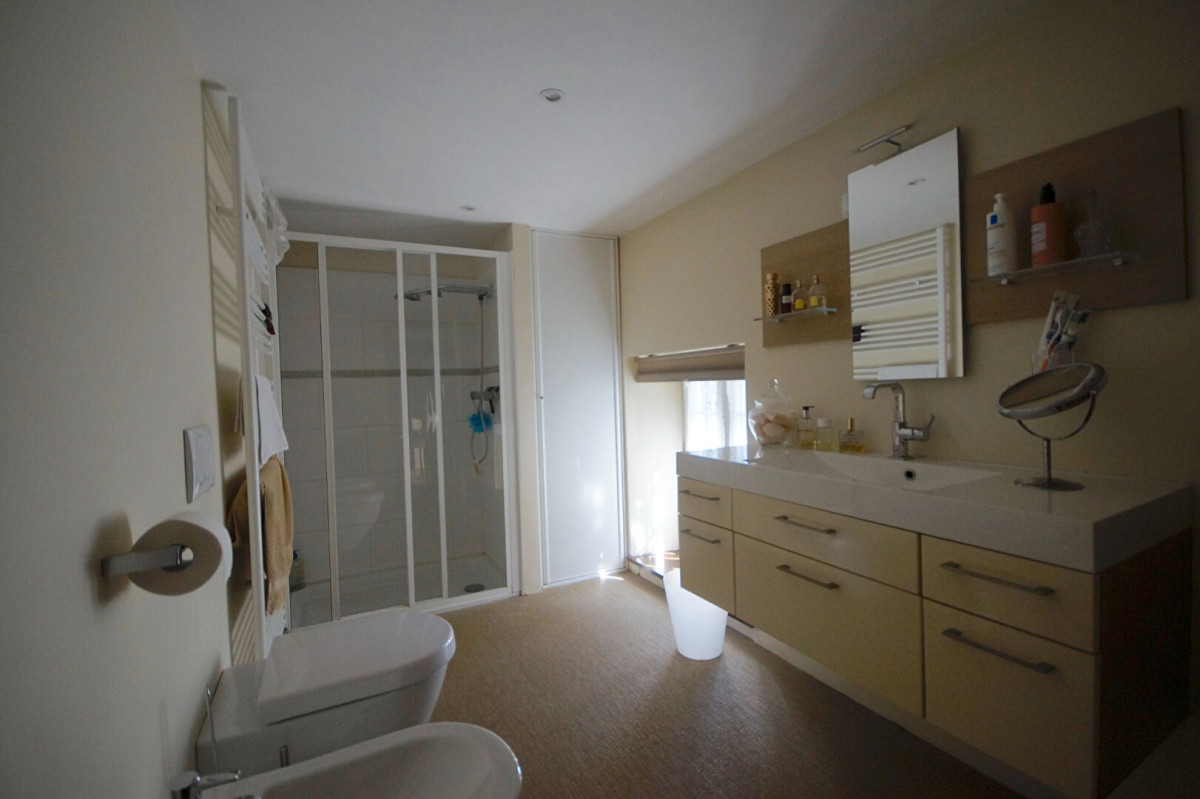 Salle de bains familiale avec baignoire, douche, lavabo et WC.