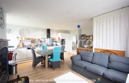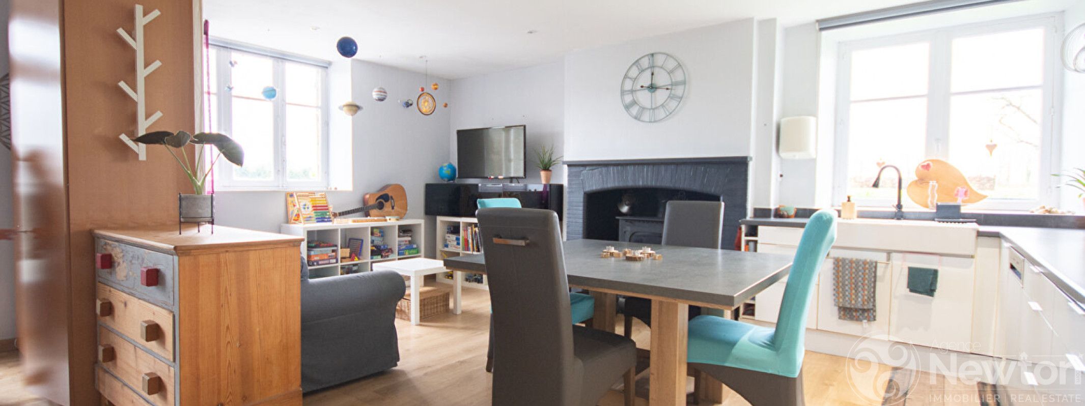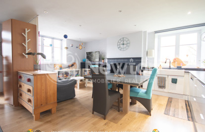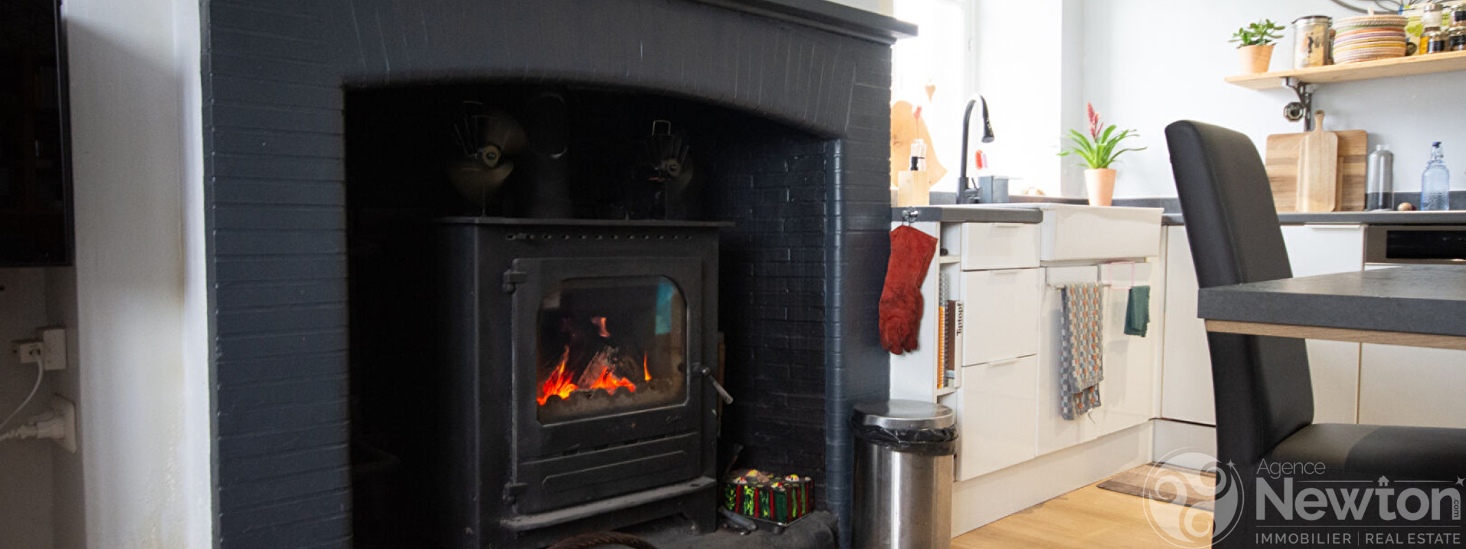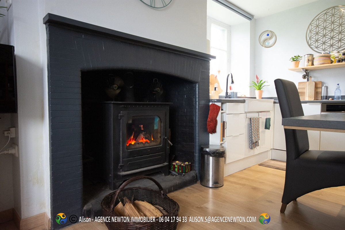 Séjour avec cuisine (32 m²) poêle à bois avec bouilleur pour radiateurs et chauffage au sol